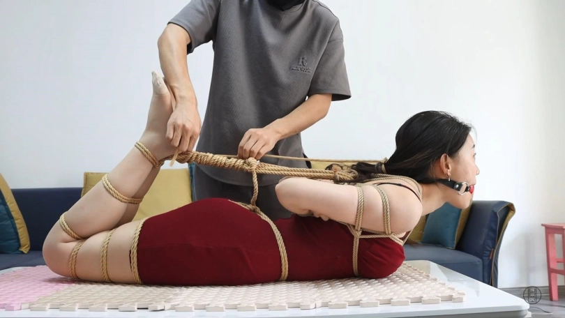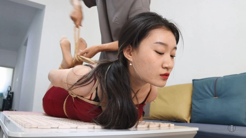 思思以前经常跟男朋友玩捆绑游戏,但是已经有段时间没玩过了,今天思思特意换了一身性感的吊带连衣裙,想男朋友绑她。男友把她驷马紧缚起来放在茶几上,用口球堵嘴,然后就去沙发上玩游戏了。思思挣扎了半天发现越挣扎越近,想让男友给解开但是说不出话,只能干流口水。男友打了两把游戏都输了,心情很差,就像整一整思思,就跟她说楼下有个快递要去拿,在楼上好好玩吧,把思思从茶几上拎到了地上。男友走之前还把思思从头到脚挠了一遍,并把思思的手机放在了地上,说出什么意外的话就打电话联系他,说完就头也不回的出门了,只留下了被紧缚的思思在地上挣扎。