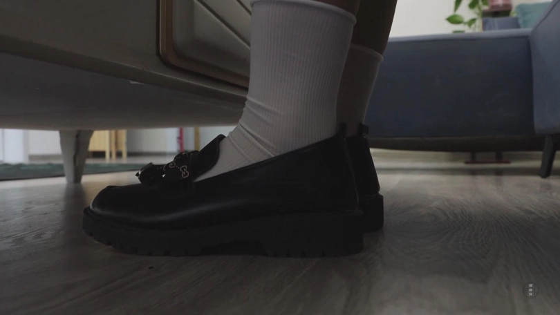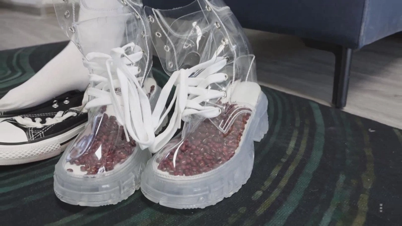 准备妥当后,小清取来那双透明马丁靴,将大量的红豆倒入马丁靴,使之铺满鞋底,这样一来清的小脚便只能踩着这些红豆艰难的挤在马丁靴里,而透明材质的靴子能够清晰的看到小脚被折磨的样子,清将脚塞进靴子后系紧鞋带,然后将脚镣,手铐和拇指铐的钥匙分别塞进三只袜子里,然后将袜子放在三个不同的位置,等下她将会带着浑身的束缚艰难的取回钥匙。