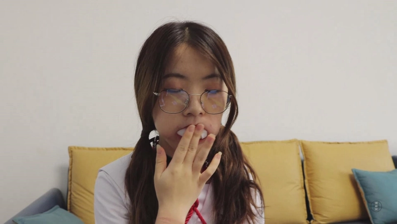 在正式开始自我奴役游戏之前,需要先准备好道具才行,但由于刚才的憋尿挑战失败,小清决定给自己增加难度,以被绑着的状态去准备自我奴役需要的道具。想着,她取出了绳子和一双白色长筒丝袜。