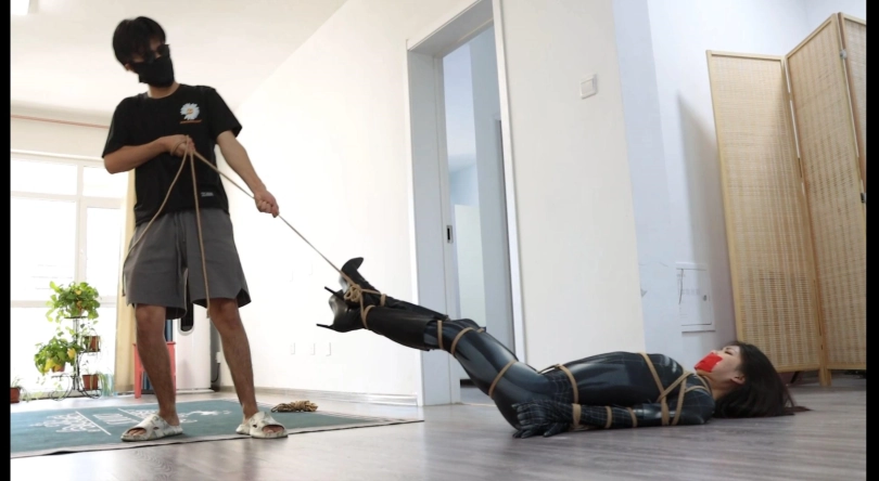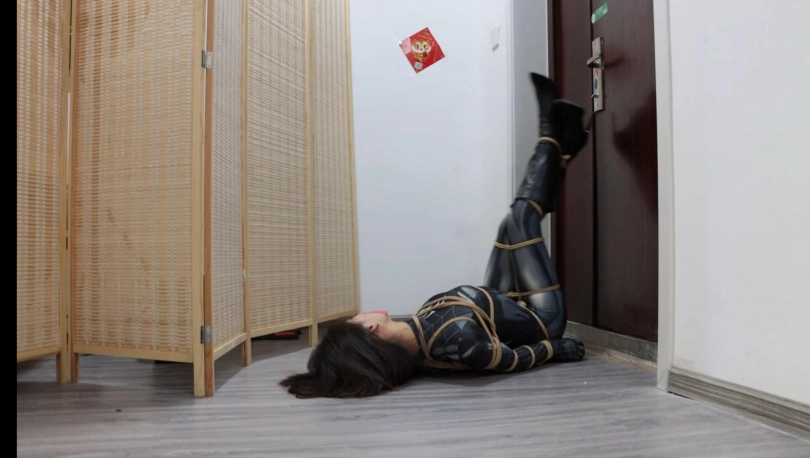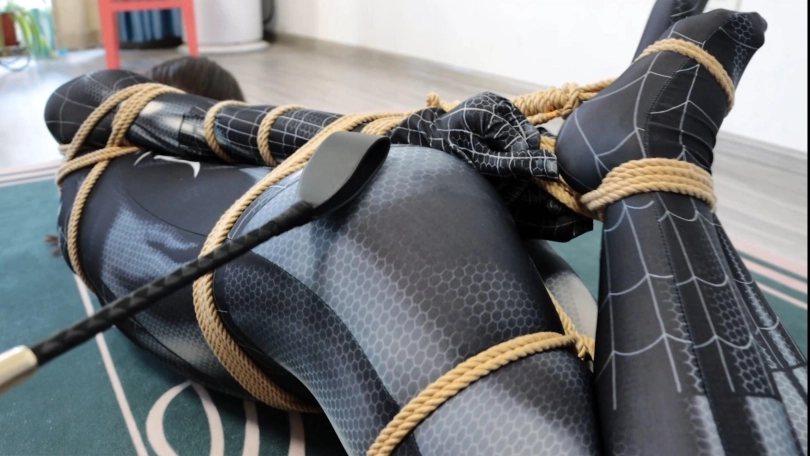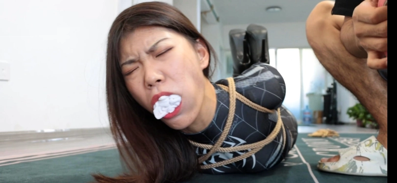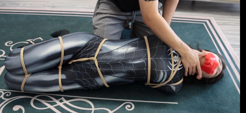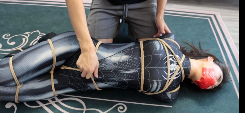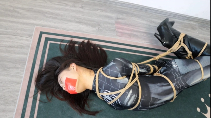 第一幕,黑色女蜘蛛潜入坏人老巢,在客厅发现了一堆绳子的作案工具,进行拍照取证,为寻找更多的证据,她继续前往房间寻找,在翻箱倒柜时发现了一张纸条:早料到你会来,这些绳子胶带就是给你准备的!女蜘蛛侠还看着眼前柜子里的证据全然不知身后的危险正在像她靠近!只见坏人拍了拍她,雨辰一回头,便挨了一记重拳,两眼一黑,可没等她反应过来,就被坏人摁倒在床上,胁迫她。雨辰心想:现在不是机会,先听他的等待机会。雨辰乖乖就范,被坏人拉起来让她举起双手,然后推搡她到了客厅,逼迫其跪下,边用绳子捆绑她!上半身欧式直臂缚,下半身股绳,大腿根,小腿,脚腕均被结结实实捆绑,坏人拍了拍雨辰的翘臀,决定将她玩弄一番,驷马倒攒蹄安排上,接着用毛巾堵住雨辰嘴巴,用五块布基胶带封上。然后开始拍打雨辰的翘臀,翻个身拉她股绳,好不快活。玩弄结实,坏人决定去销毁证据,把雨辰脚腕交叉,接着更严厉驷马倒攒蹄捆绑,雨辰上半身翘起来,虽然去销毁证据了。雨辰在地上挣扎并呜呜呜。
