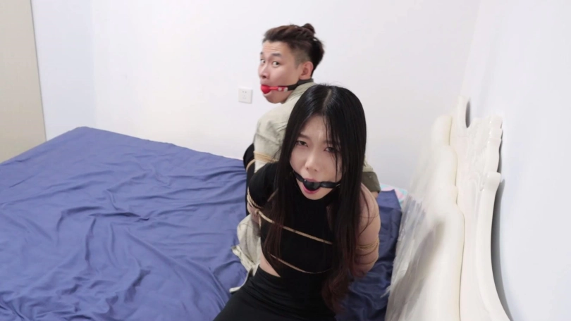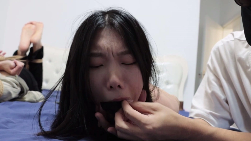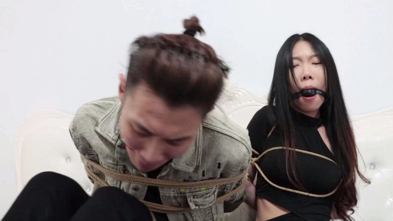 很快,琪梦和自己表弟一样被五花大绑,穿着黑色短丝袜和脚踝也被并拢捆绑住,口中被劫匪强行带上塞口球。