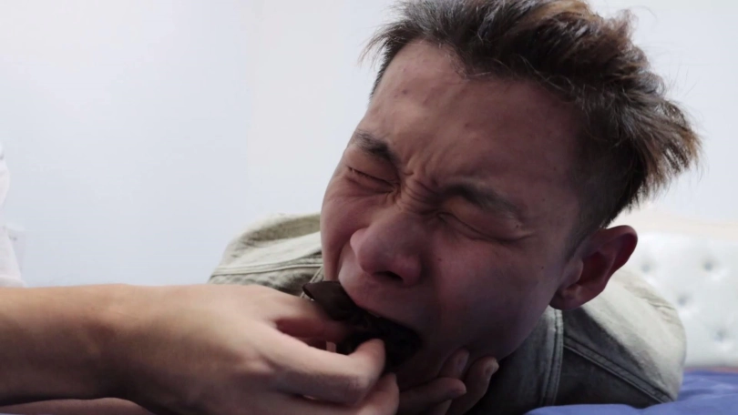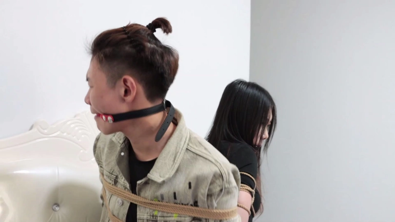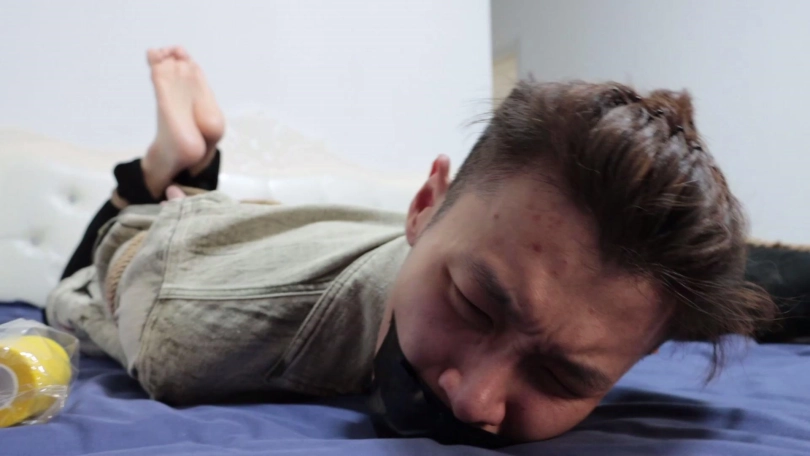 气急败坏的劫匪看姐弟二人想跑,将他们捆成驷马,为了报复他们,劫匪把琪梦表弟脚上穿的一双原味锦纶丝袜塞到琪梦表弟嘴里,令琪梦表弟苦不堪言,拼命呜呜闷哼挣扎。