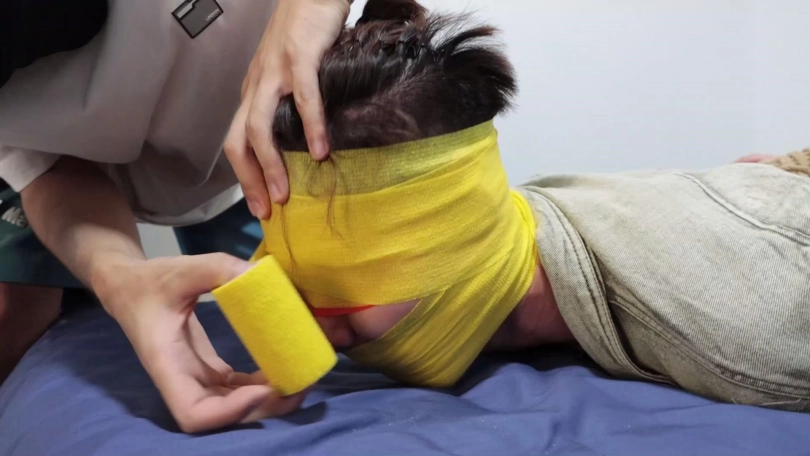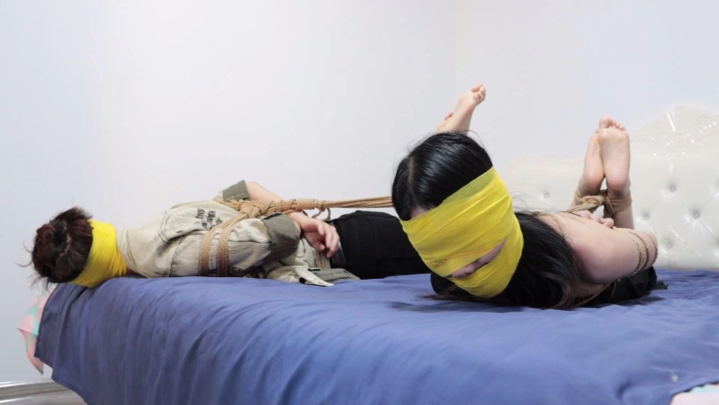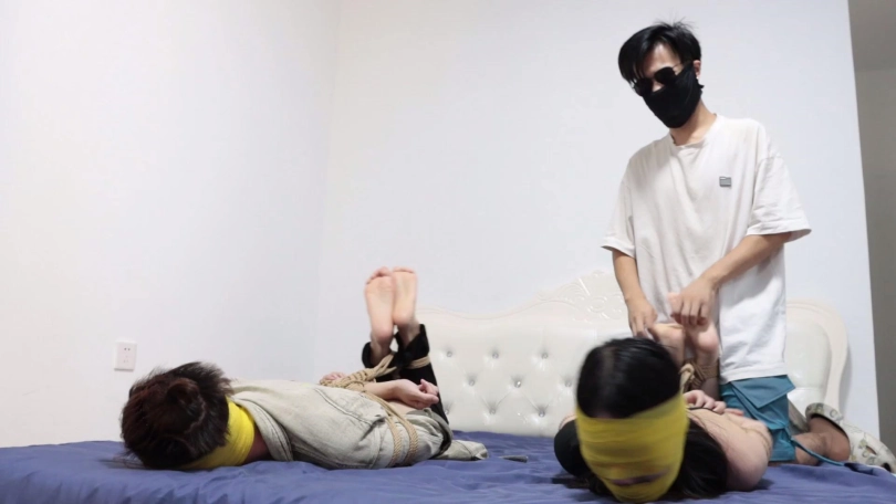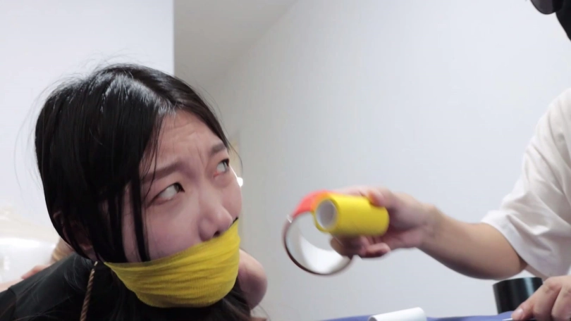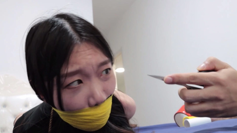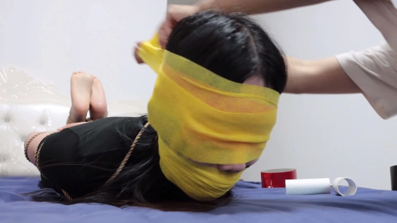 恶趣味的劫匪给床上被驷马的姐弟二人拍照,还故意拿给他们看进行羞辱,姐弟二人愤怒瞪向劫匪,劫匪一看干脆把姐弟俩眼睛给封上,先给琪梦表弟眼睛外用红色静电胶带缠绕4圈,再用黄色弹力自粘绷带缠绕4圈,给琪梦封眼时,琪梦不愿意配合不想闭眼睛,劫匪拿起剪刀威胁说不闭眼睛就把她眼珠子挖出来,琪梦无奈吓得闭眼了,劫匪遂用红色静电胶带与黄色弹力自粘绷带各缠绕4圈。