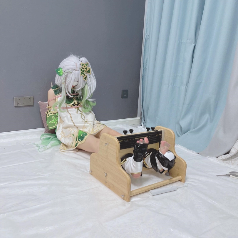 小草神醒来,发现自己被紧紧绑住,一双白嫩可爱的小脚丫也被死死卡在足枷里牢牢锁住,动弹不得。