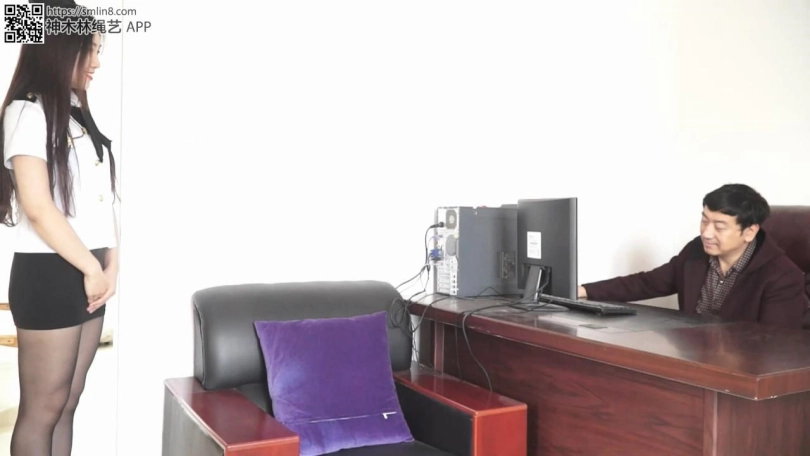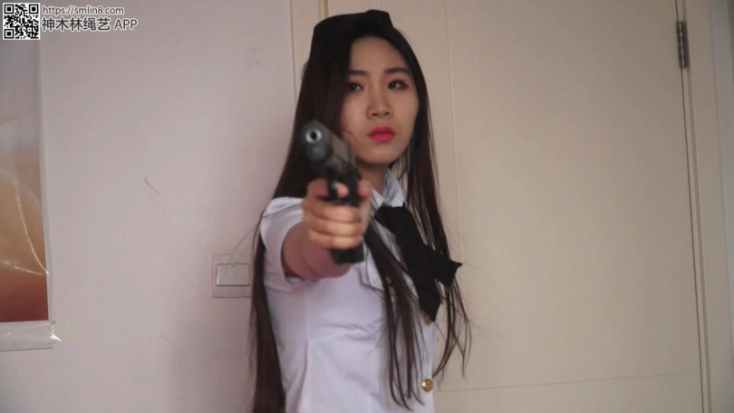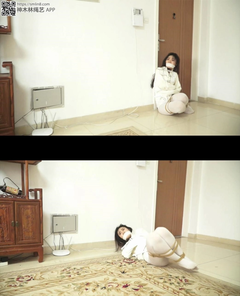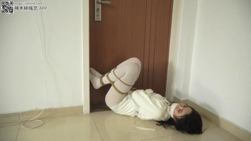 女警想用白丝美脚够门把手,但丝袜美腿是被折叠合并捆绑的,她根本无法够到门把。