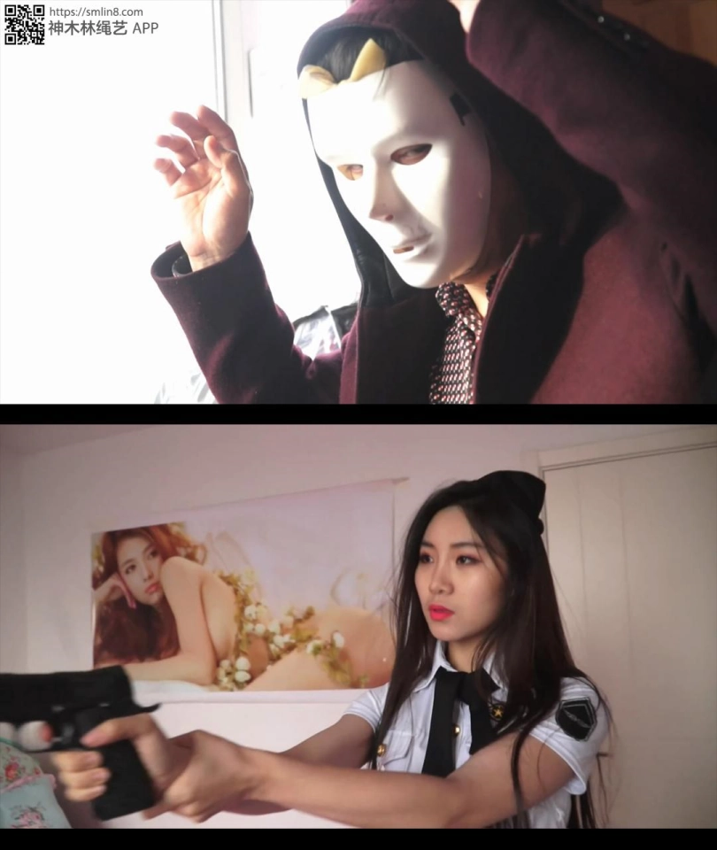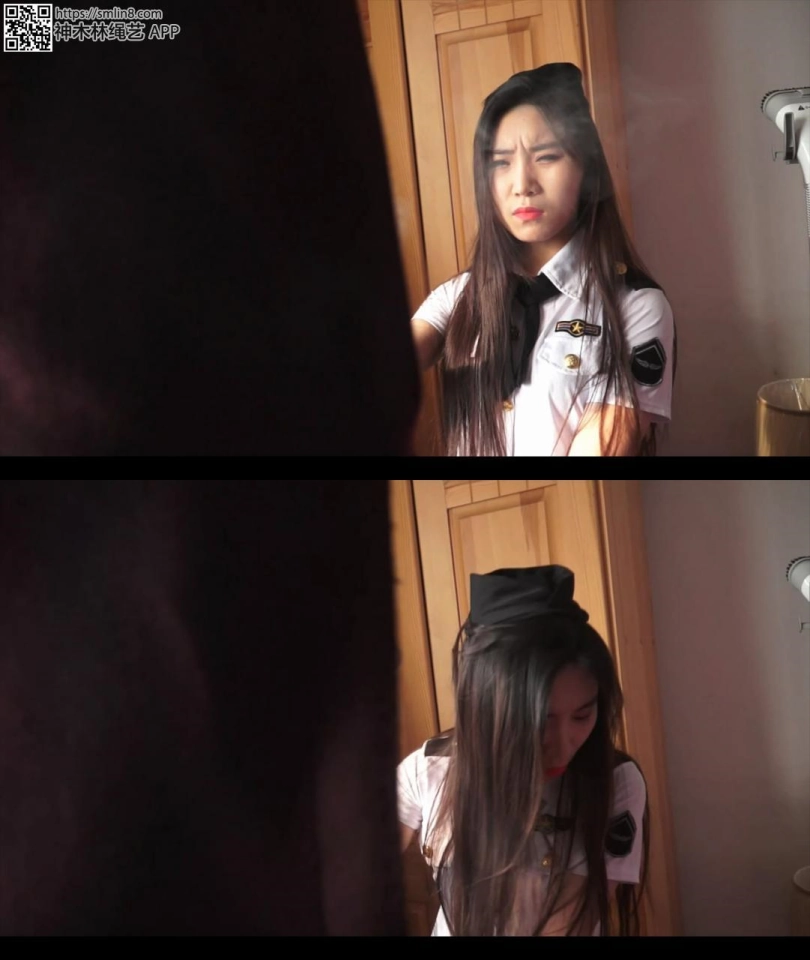 女警费了九牛二虎之力终于直起身子,用头撞门把,但可惜,还是没用。