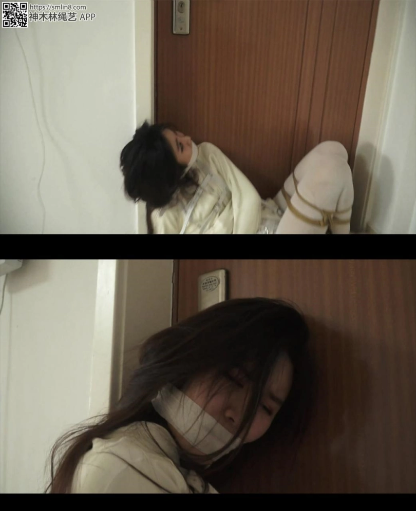 女警挣扎一会,发现根本没用,于是她艰难的蠕动到门口,想逃出去。