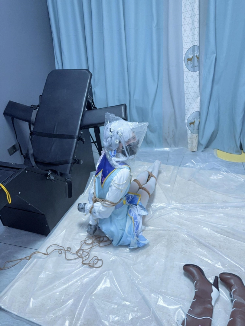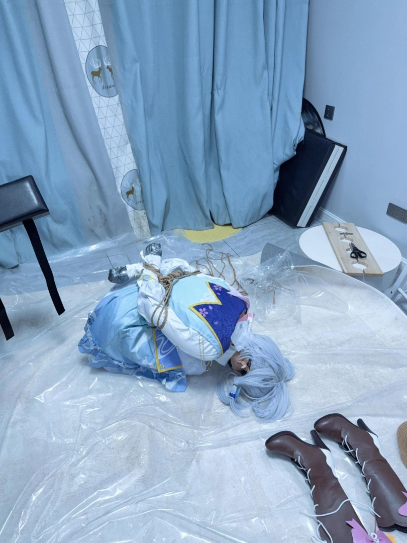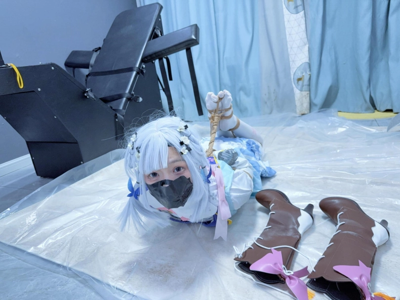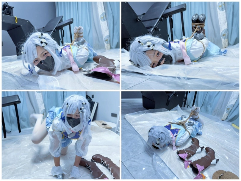 双手握拳,银色胶带包住小拳头,胶带包手~然后是一个经典的日式驷马,着重腿部拘束,膝盖、小腿、脚掌都用绳圈加固,值得一提的是高跟长靴也绕过脚掌绑上了绳子,并且把高跟鞋的鞋跟也绑在一起。
