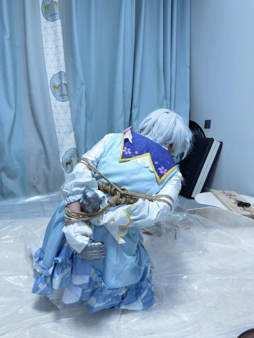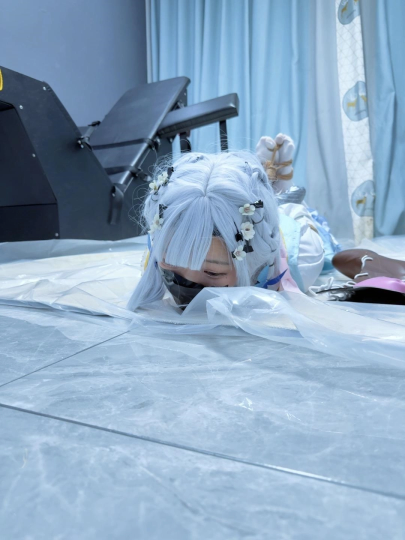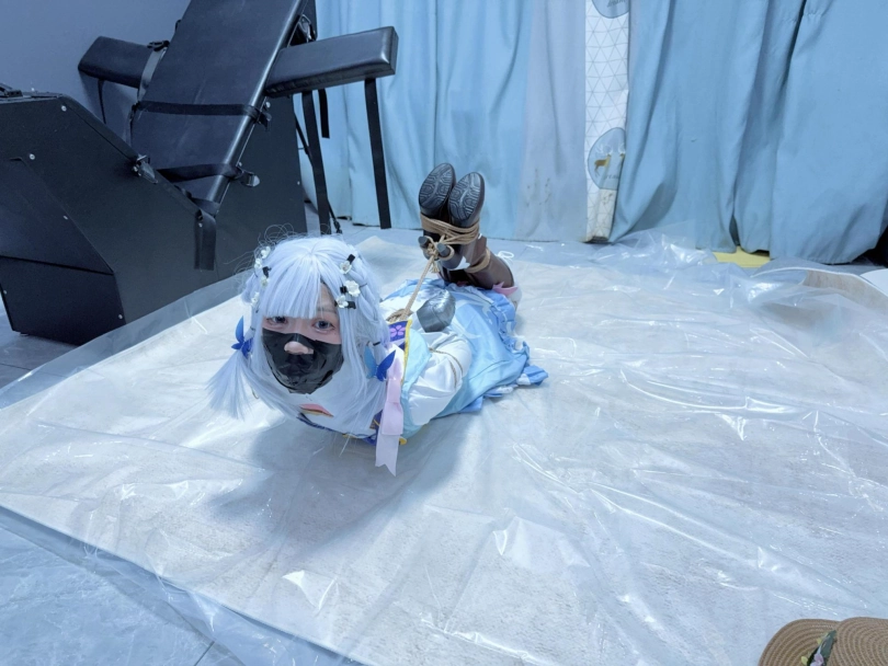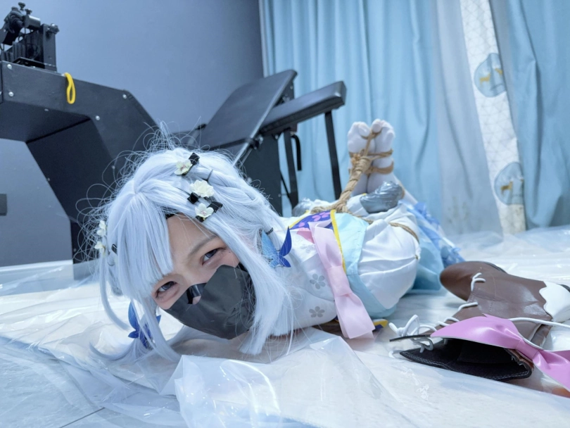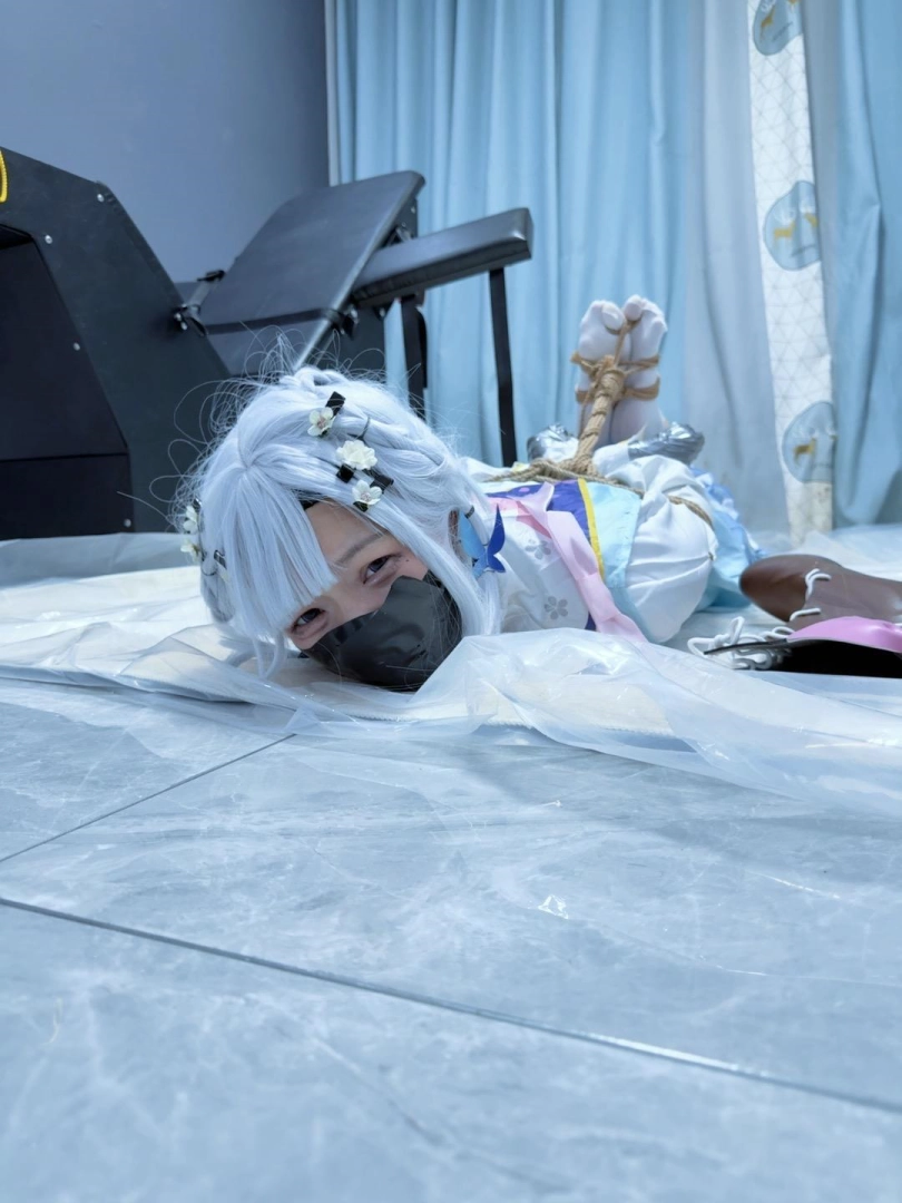 双手握拳,银色胶带包住小拳头,胶带包手~然后是一个经典的日式驷马,着重腿部拘束,膝盖、小腿、脚掌都用绳圈加固,值得一提的是高跟长靴也绕过脚掌绑上了绳子,并且把高跟鞋的鞋跟也绑在一起。