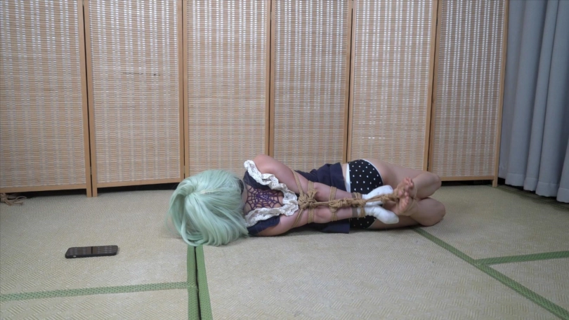 手包起来以后,直臂并肘,戴上口球,站立用脚寻找手机