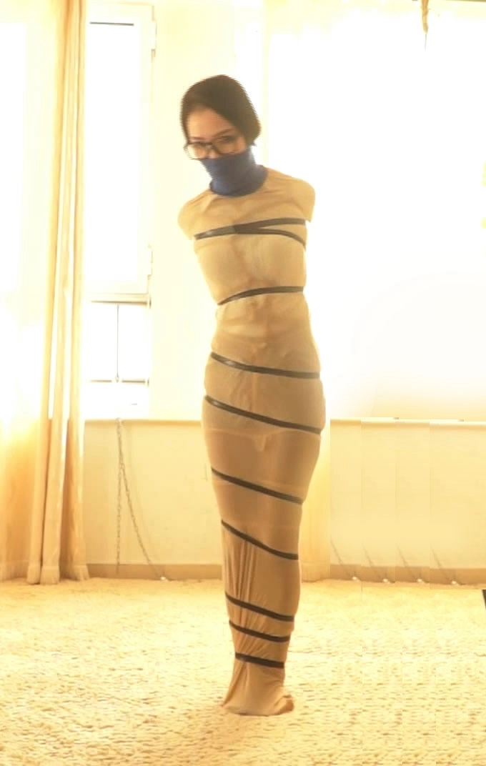 可能坏人感觉还不过瘾,最后又给美女来了个丝袜全包,多层堵嘴,外面捆绑还上胶带,这下美女真的成为一个丝袜人棍了。