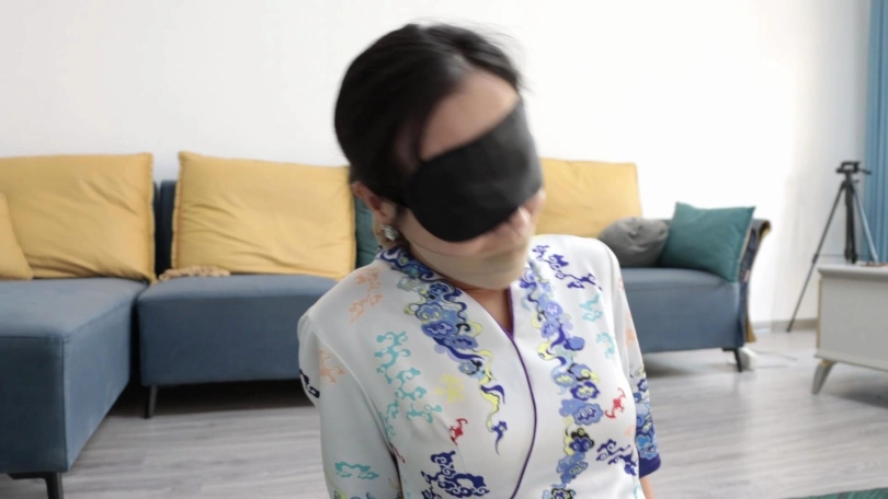 女侦探假扮成空姐不等好友到来,急于进入绑匪老巢,发现后被双手捆绑在两边,双腿交叉捆绑,逃跑不成最后被绑匪塞入乳胶全包袋子挣扎。