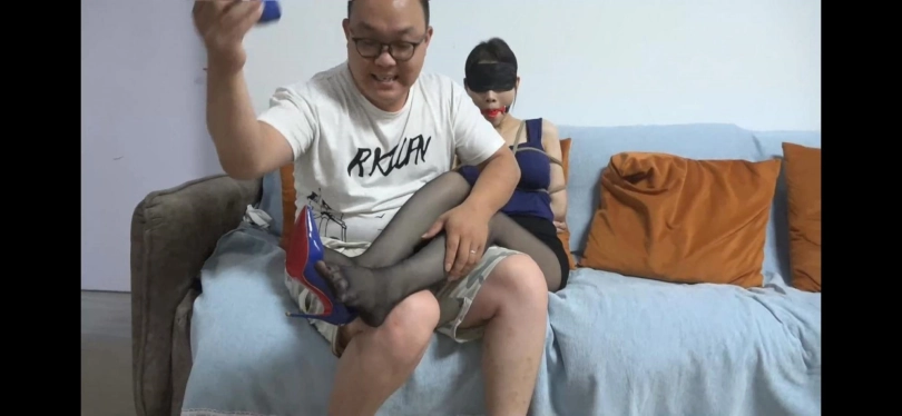 男子将刘小萌重新抱回沙发上,为了惩罚不听话的刘小萌。男子脱掉了刘小萌脚上的高跟鞋,抓住她的黑丝美腿,不停的挠着刘小萌的脚心。脚底传来的瘙痒感让刘小萌呜呜的叫了起来。