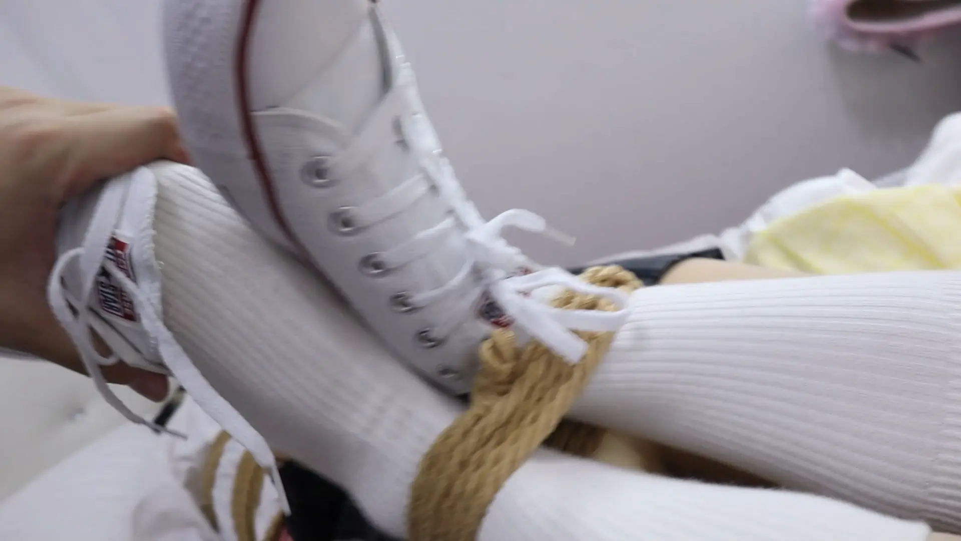 【荷仙少女】又见少女H鞭打挠到抽搐 帆布鞋长筒棉袜+简驷马缚+塞嘴+封嘴+鞭打虐待+驷马挠+最后女孩H旁白讲话,强行把布条完整塞入少女H嘴里塞满并用胶带封住,双手粉铐撩绳子拉住脚上的绳子弯曲腿部,使劲