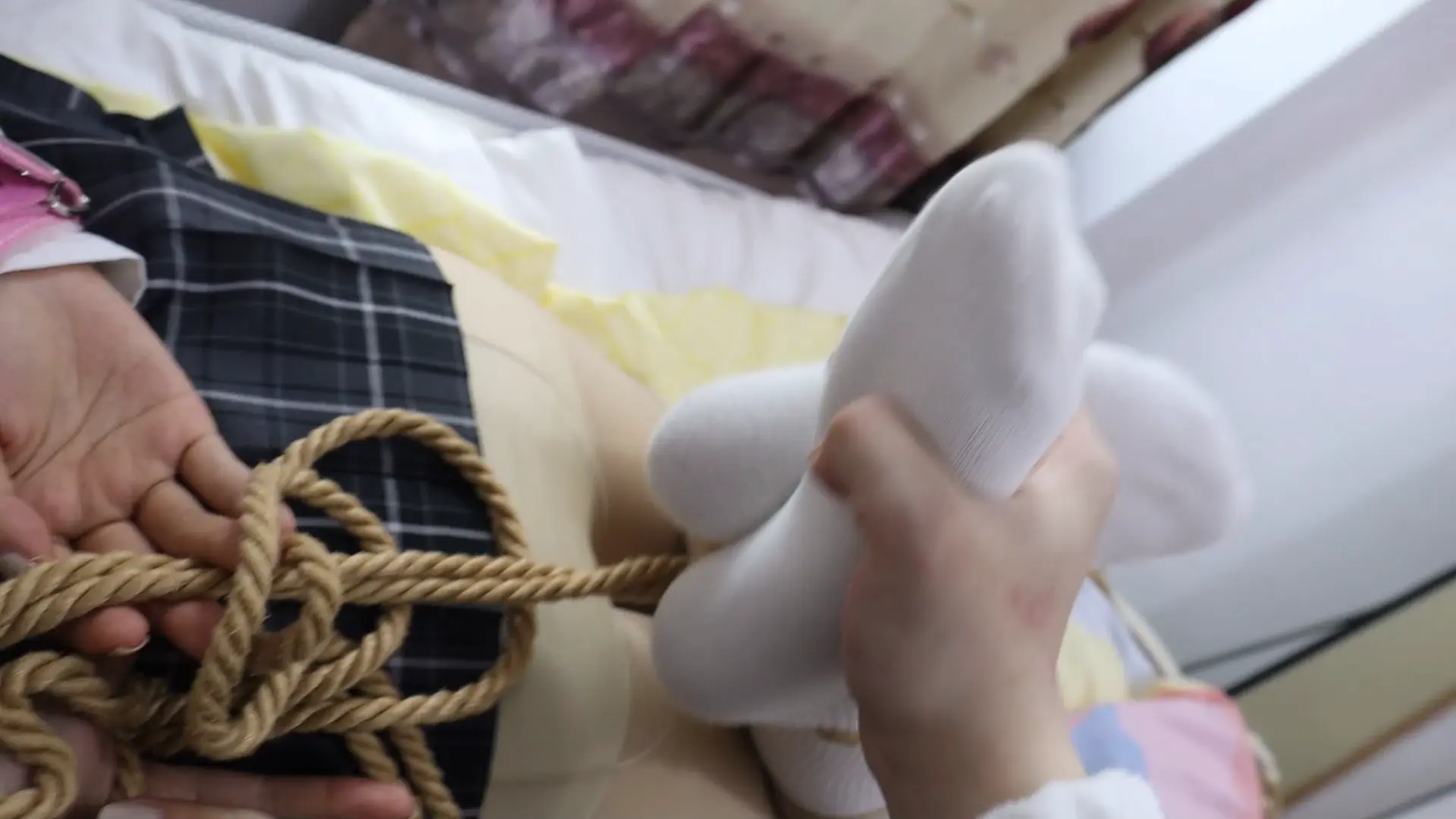 强行把布条完整塞入少女H嘴里塞满并用胶带封住,双手粉铐撩绳子拉住脚上的绳子弯曲腿部,