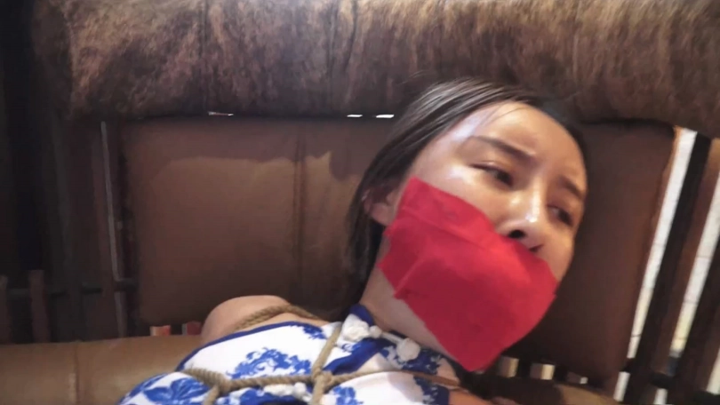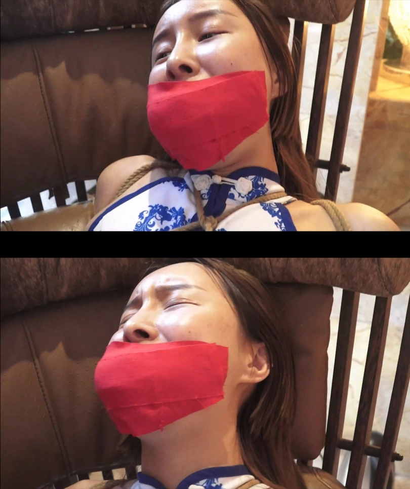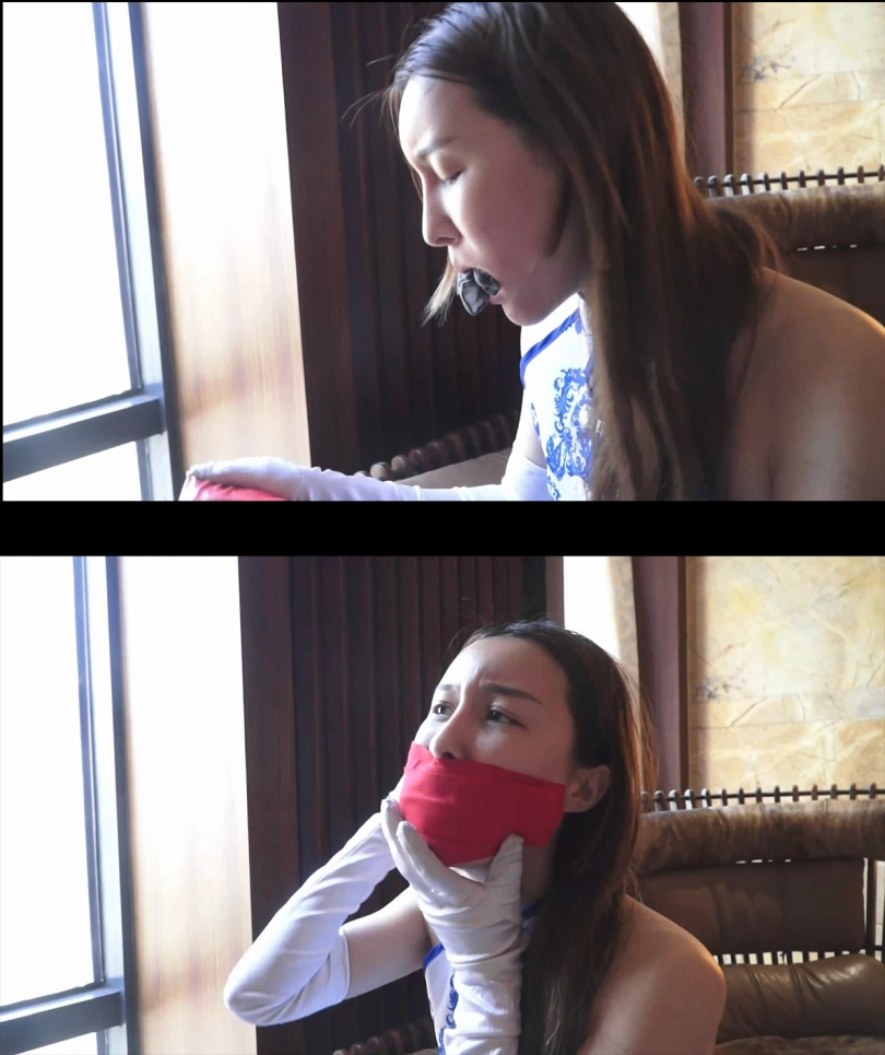 她自己的手要把丝袜塞入自己嘴里,她一开始闭嘴摇头不想被堵嘴,但是最后还是被塞入了嘴里,然后胶带封嘴。