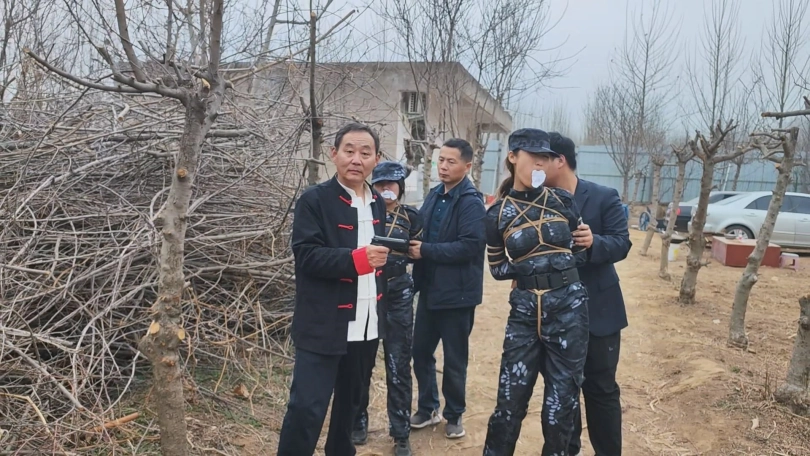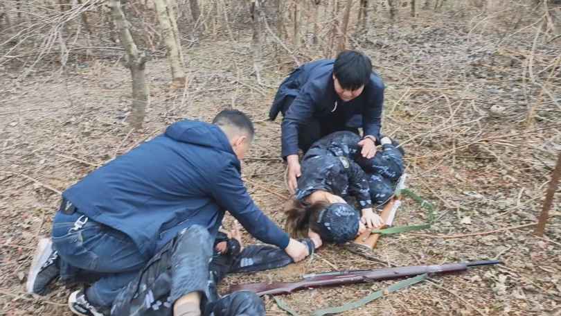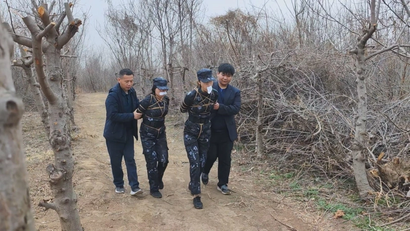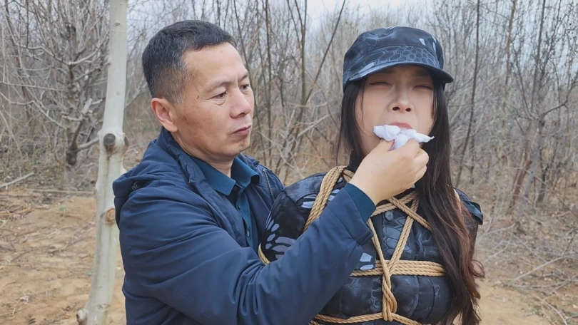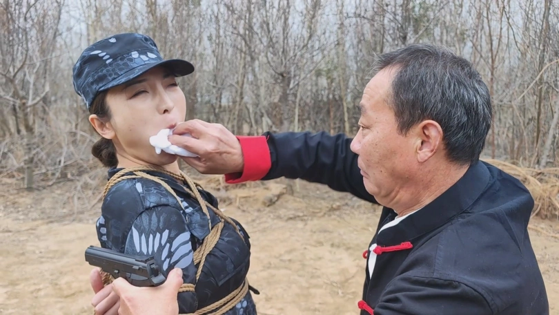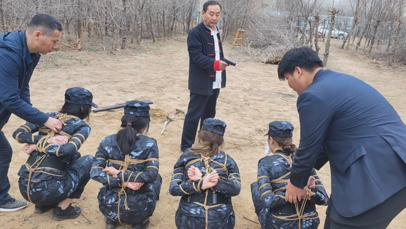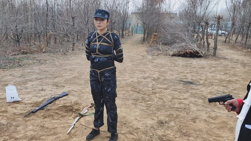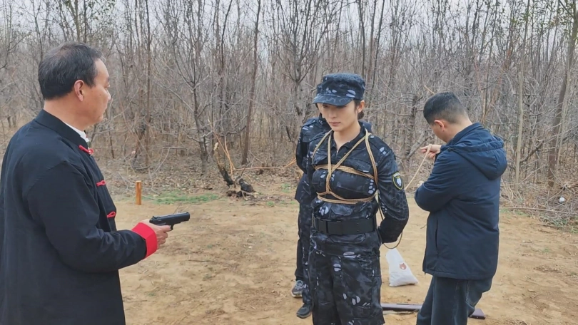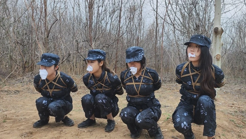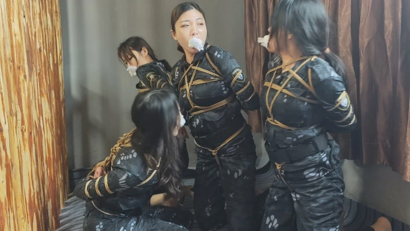 女队长带着三位队员围剿藏在深林中的歹徒,两名队员被埋伏绑了起来,队长为了队员的性命只能主动投降束手就擒,歹徒将四女关押了起来。
