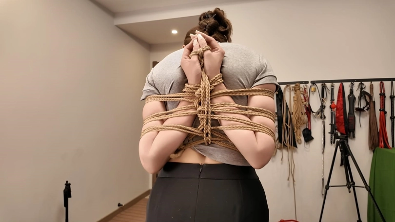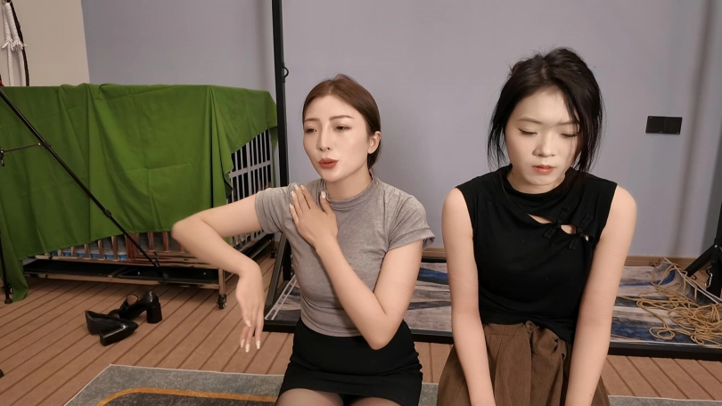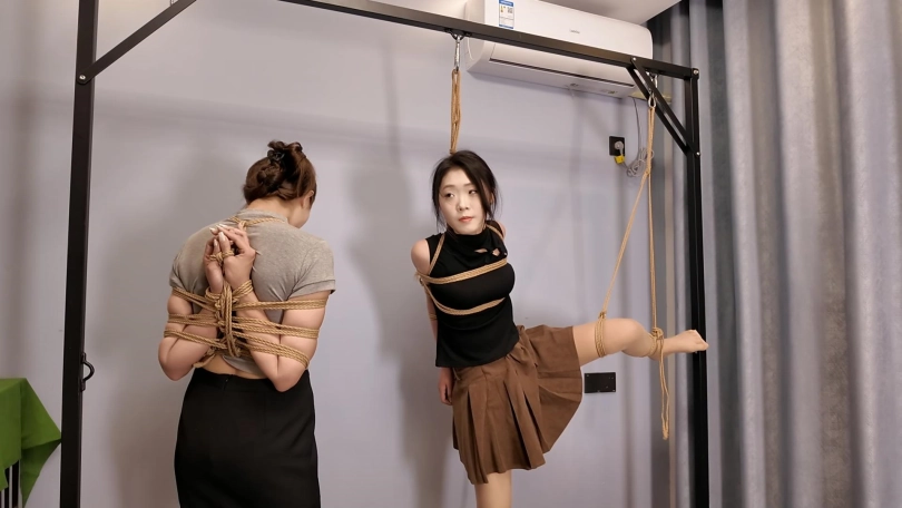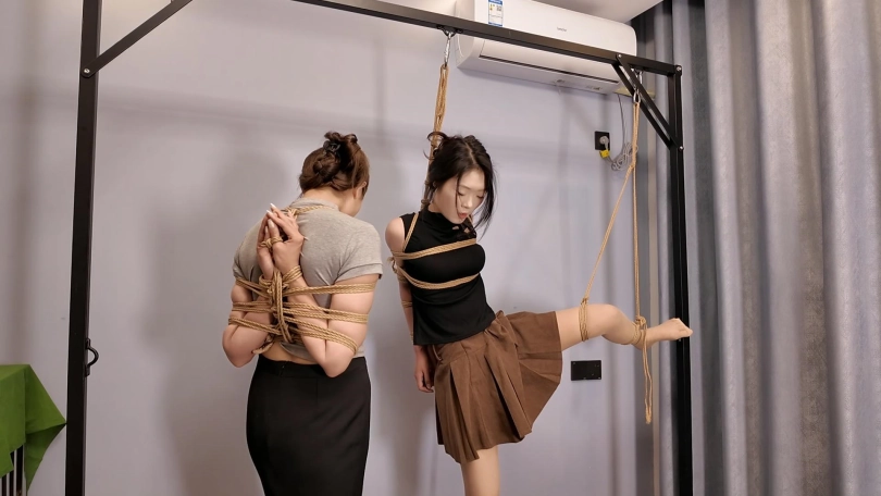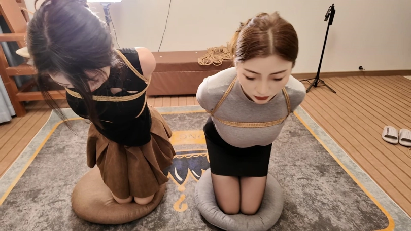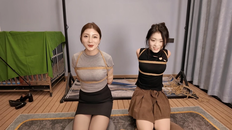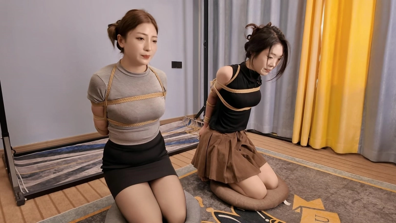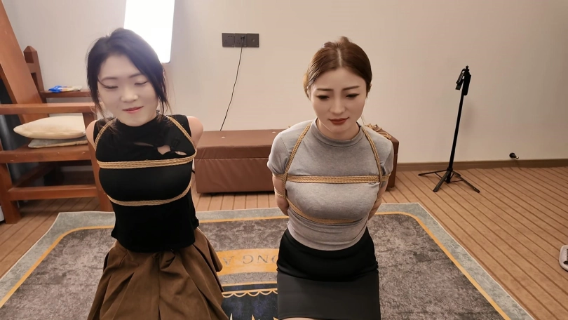 佳佳后手观音、小夏直臂、把两个美女紧紧的绑起来,鞭打,跪,调,最后采访捆绑的感受,她们觉得很舒服,很喜欢