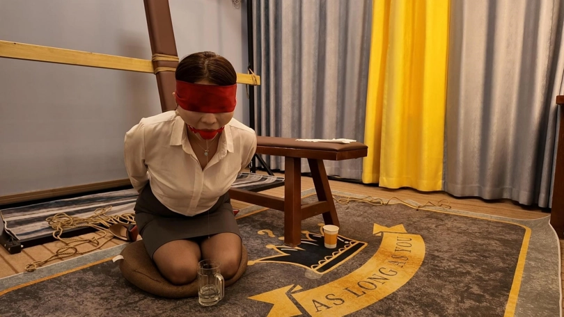 胶带捆的特别紧,也特别有感觉,接下来又给佳佳来了个欧式紧缚,这个客户是个资深爱好者,绑的特别紧,也特别好,佳佳柔韧性好不错,不过太紧了,不一会就受不了了,接下来的项目是柠檬口球口水收集,佳佳自己蒙是眼睛,客户趁着佳佳看不到,偷偷把口球换成最大号的,让佳佳自己带,真没有想到,超大口球竟然带上了,按口水流的哗哗的