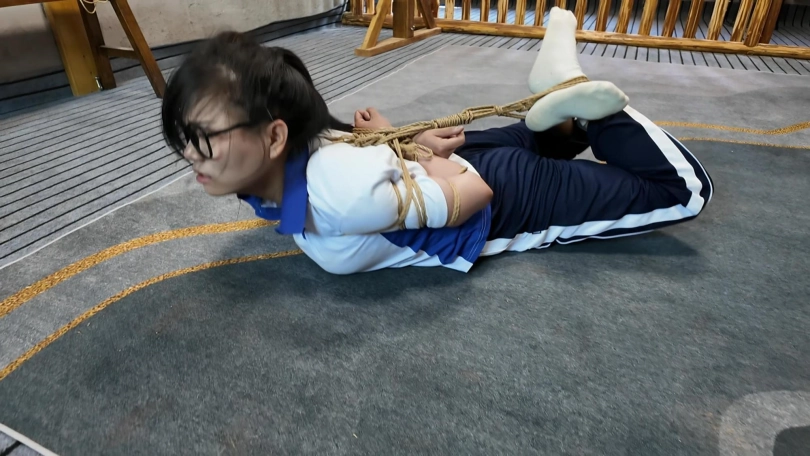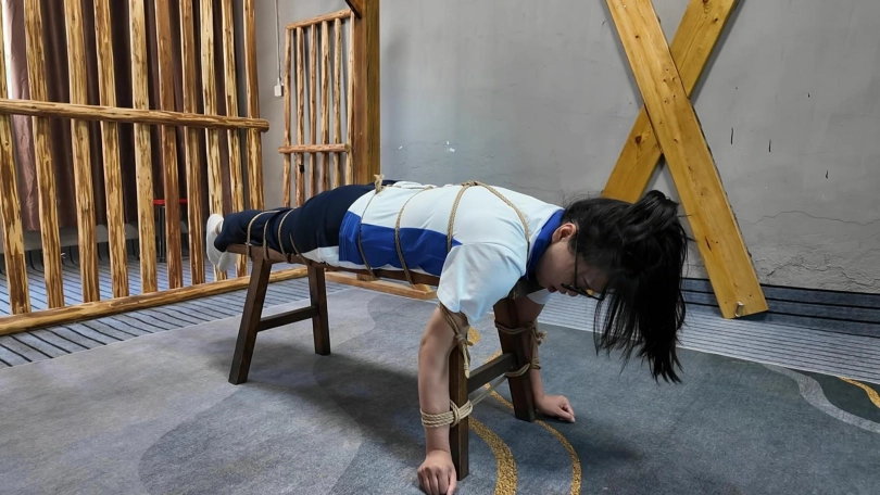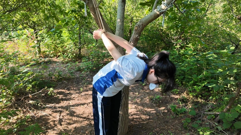 小遥逃学,被教官抓回管教,先吊到树上,又绑到椅子上面打屁股,又吊起来放置,没想到小遥自己慢慢解开,刚想逃跑,又被抓回,这下驷马紧缚,看她还跑不跑,罚深蹲,蛙跳