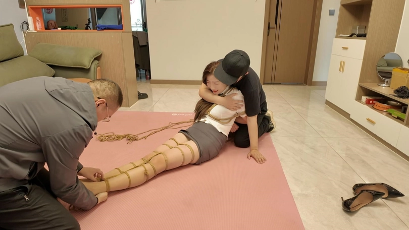 女老板挣扎捆绑,跑着想要逃脱,被听到动静的两名讨债人飞快的捉了回来,从新强制按着捆绑起来,这一次狠狠的把腿捆成个粽子,并且在房间搜出二十五现金,更加证实了女老板是刻意拖欠工人工资,两名讨债人决定好好的折磨收拾她