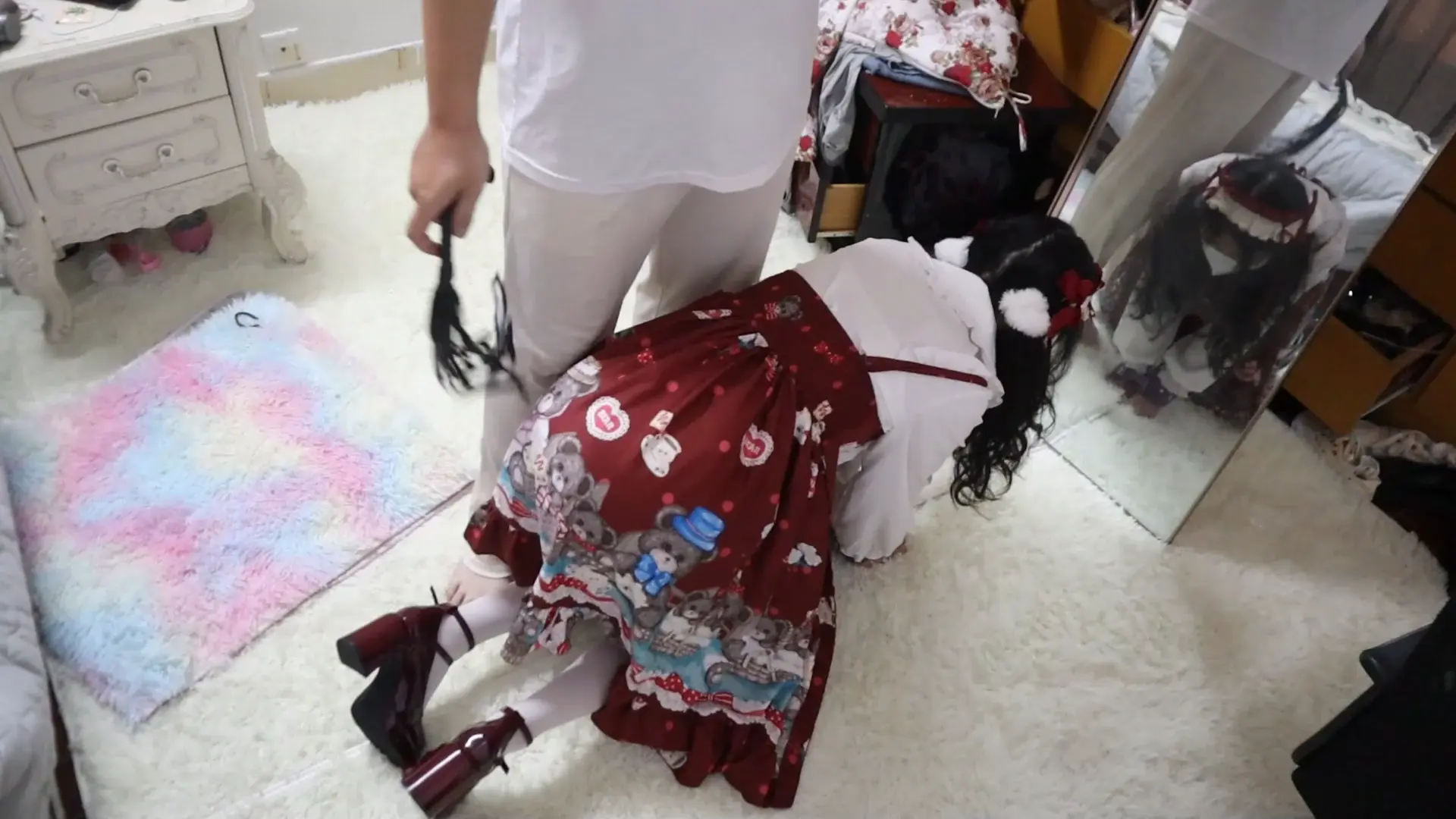 【荷仙少女】圈养超大只高挑漂亮洛丽塔白丝少女母狗虞琳,对着镜子跪爬一边害羞一边忍不住想的母狗,手脚被圈住,脖子上带狗链,调教之余掀起裙子被鞭子狠抽呜咽跪爬,一边被虐一边呜呜浪叫,最后虞琳母狗抓着链子自娱自乐