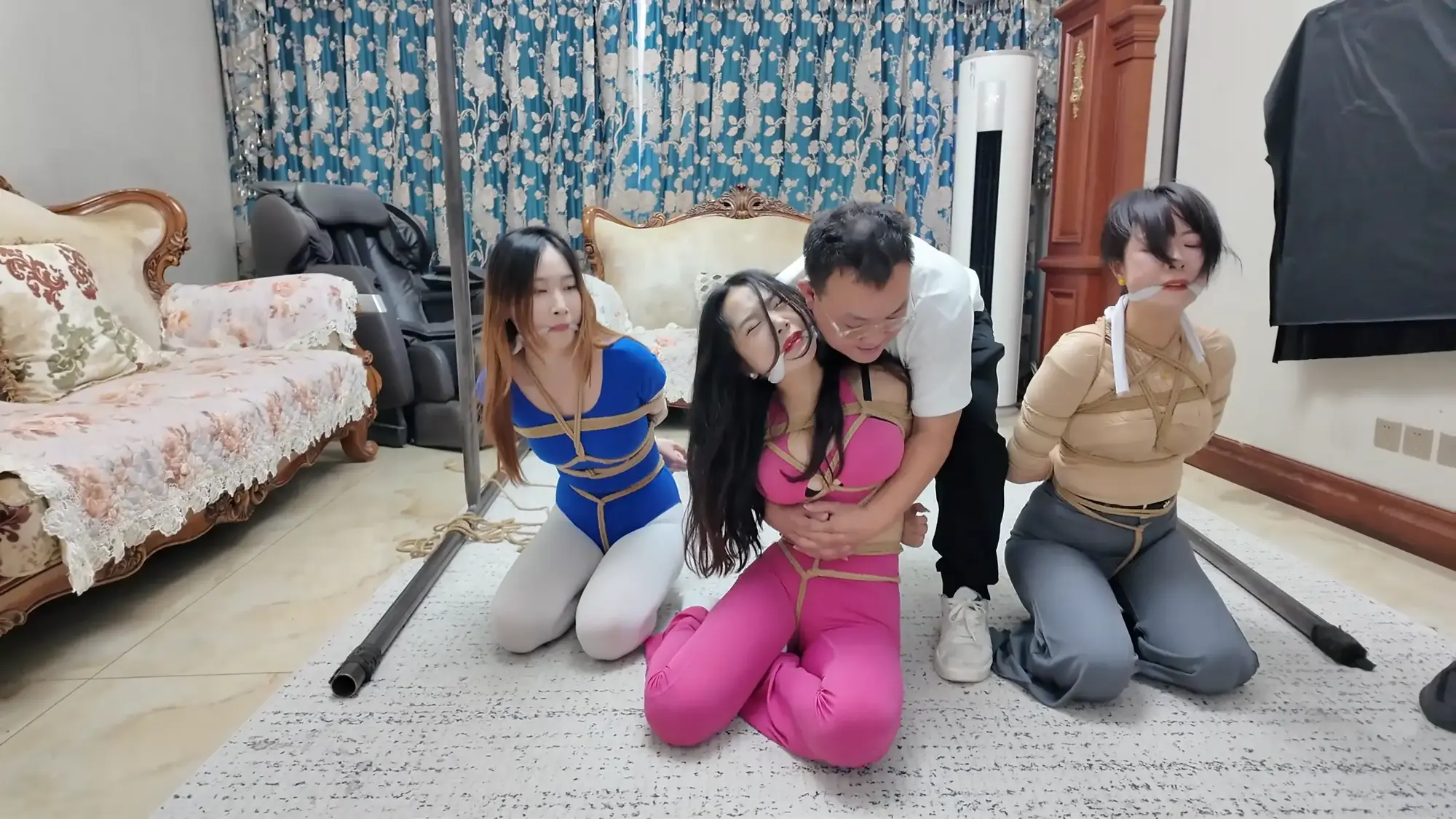 画面一转,雷姐被松开绳子,脱去了外衣,大哥用绳子将雷姐后高手紧缚,并将股绳用力绑上,痛得雷姐直叫,大哥见雷姐还是不肯屈服,便开始拉扯雷姐手臂的绳子,由于后高手绑的很紧,雷姐被绳子勒的非常痛,于是求饶,大哥见雷姐示弱,依旧没有停手,又开始恶趣味的拉扯雷姐的股绳,雷姐难受的大叫。于此同时,一旁的e小姐与南清再次被驷马捆绑放置在地上挣扎,e小姐环顾四周,发现了掉落在角落里的手枪,她短暂思考了后暗自窃喜,刻意大笑了起来,大哥甩开雷姐松开了e小姐的口球,质问她为什么笑,雷姐用挑逗的语气表示这么瞎折腾太浪费体力,耽误办正事,大哥乐呵着问e小姐是不是想替雷姐受罪,e小姐回复只要不伤害她,就随他们处置,见e小姐这么顺从大哥兴奋了起来,他站起身一拳将雷姐锤倒,抱起e小姐进了卧室。e小姐躺在床上用脚不停挑逗大哥,失去理智的男人慢慢凑近了e小姐,却不料e小姐突然一头将他撞倒,并顺势用手掐住了他的脖子,男人奋力挣扎还是被杀,e小姐挣脱了束缚缓缓走出卧室,见到小弟还在玩弄雷姐和南清,雷姐与南清看到挣脱束缚的e小姐,不停喊叫,但嘴被口球塞着无法说话,没有察觉的小弟被e小姐从背后扭断了脖子。e小姐开始玩弄两人,她先是抚摸雷姐的大胸,拉扯她的股绳,然后拍打雷姐的屁股,最后去另一边玩弄南清的脚与腿。过了一会儿,e小姐表示自己已经玩够,该带两人上路了,她捡起地上的手枪后突然神情凝重,呵斥躲在角落里的人出来。一位面具人现身,他夸奖了e小姐的本领,几番对话后e小姐得知神秘人是来劫货的,神秘人表示她们三个女人一个也逃不了,e小姐自信的举起枪准备了解了神秘人,却不料神秘人一发石子就将手枪打落,e小姐刚准备捡枪,神秘人已经冲上前一脚踩住,e小姐急忙后退,才发现眼前神秘人实力深不可测,接着神秘人又一发石子击中e小姐的腹部,他向前掐住跪倒在地的e小姐,用绳子将e小姐再次绑了起来。