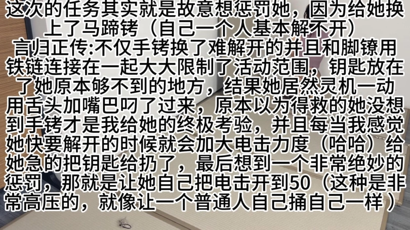 2:欲梦被手铐脚镣锁在一起并用铁链限制手和脚的动作幅度,PY被塞上电击肛S(肛S会运行15~20秒然后暂停 5秒如此循环)要求在有限的时间内解开并拔出肛S。