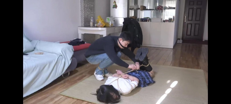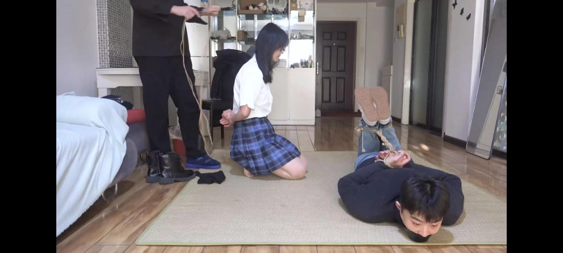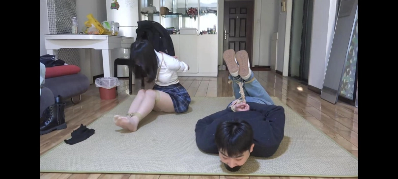 女生慢慢推开门进来,发现男生被绑在沙发上(手脚都绑着,嘴里塞了三只短肉丝袜,并带着口球),女生手足无措,男生呜吗,女生慌忙着取下男生的口球,随后一只只取出男生嘴里的短肉丝袜。 劫匪回来了。劫匪让女生脱下鞋子,脱下袜子,一只慢慢塞进男生嘴里,另一只勒(蒙)住男生的嘴。劫匪让女生换上新的袜子,穿上鞋子,给女生绑个五花,腿部捆两道,最后给女生绑个驷马。 男生挣扎着,帮女生解开了驷马,女生挣扎着坐起来,两人相互挣脱。 劫匪回来了,威胁女生再次脱下鞋子和袜子,肉丝袜一点点塞进男生嘴里,然后让女生用胶带封住,给男生随便绑个驷马。劫匪让女生穿好袜子,再给女生绑个五花,腿部绑两道。女生帮男生解开了驷马。随后男生解开了女生的绳子,女生最后一点点扯出男生嘴里的长肉丝袜
