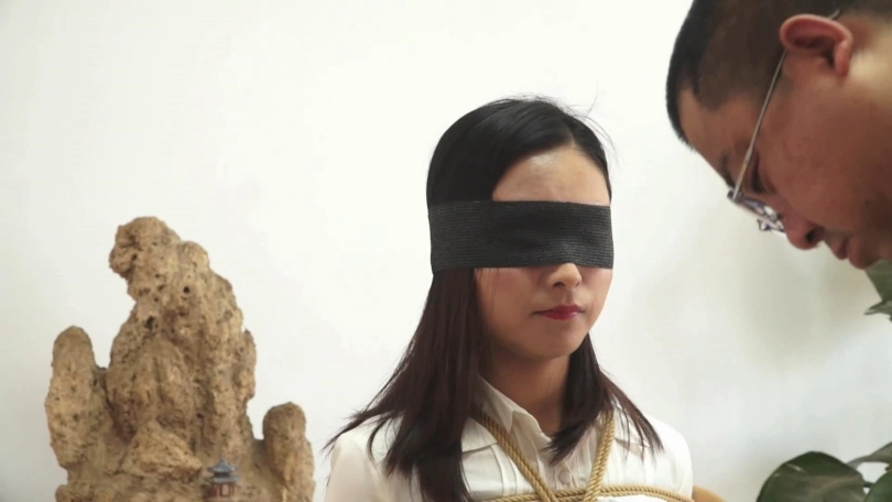 白领的双臂被牢牢绑在背后,双腿翘成二郎腿被绑在一起,眼睛被蒙住,嘴也被丝袜堵住......