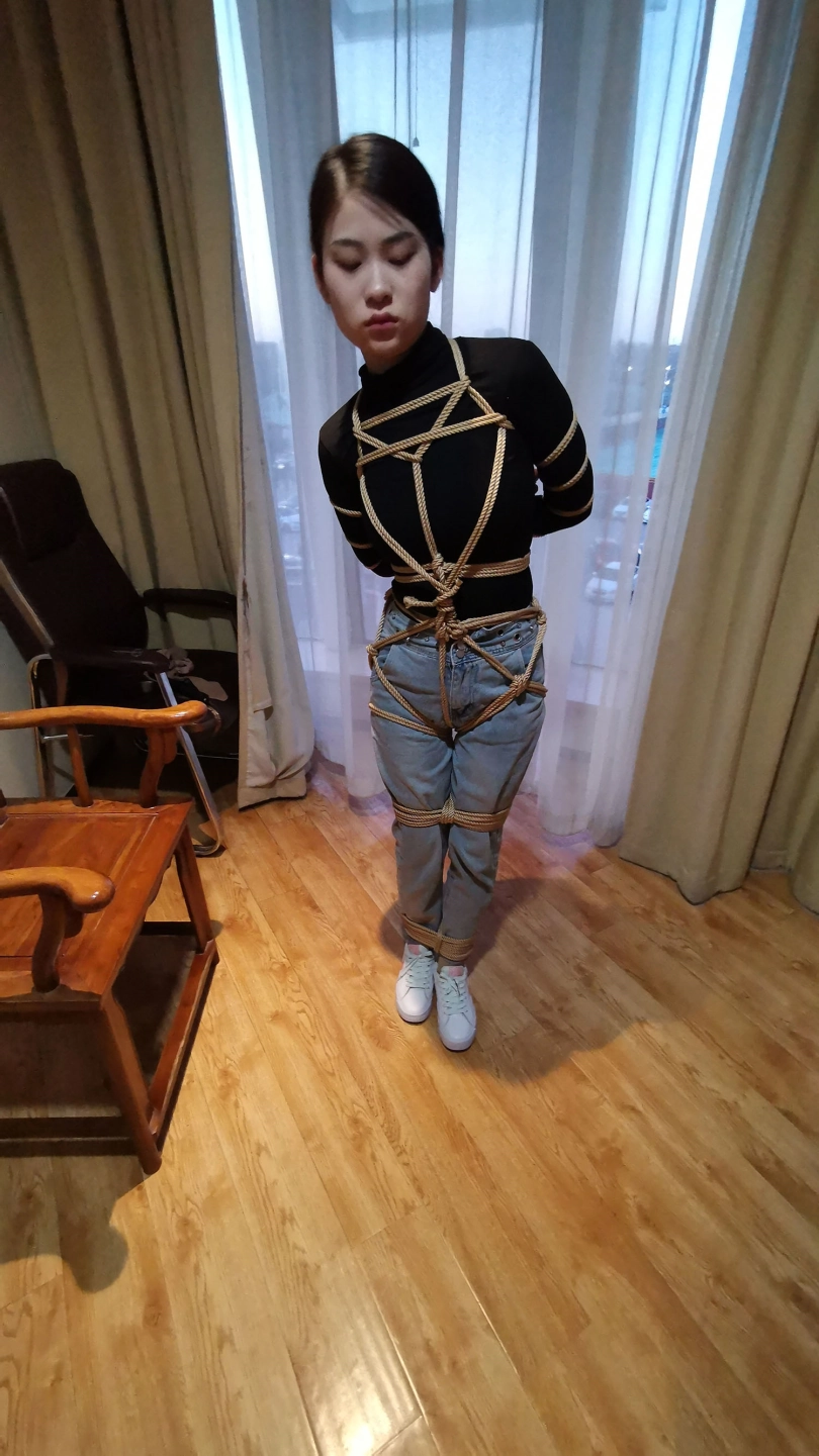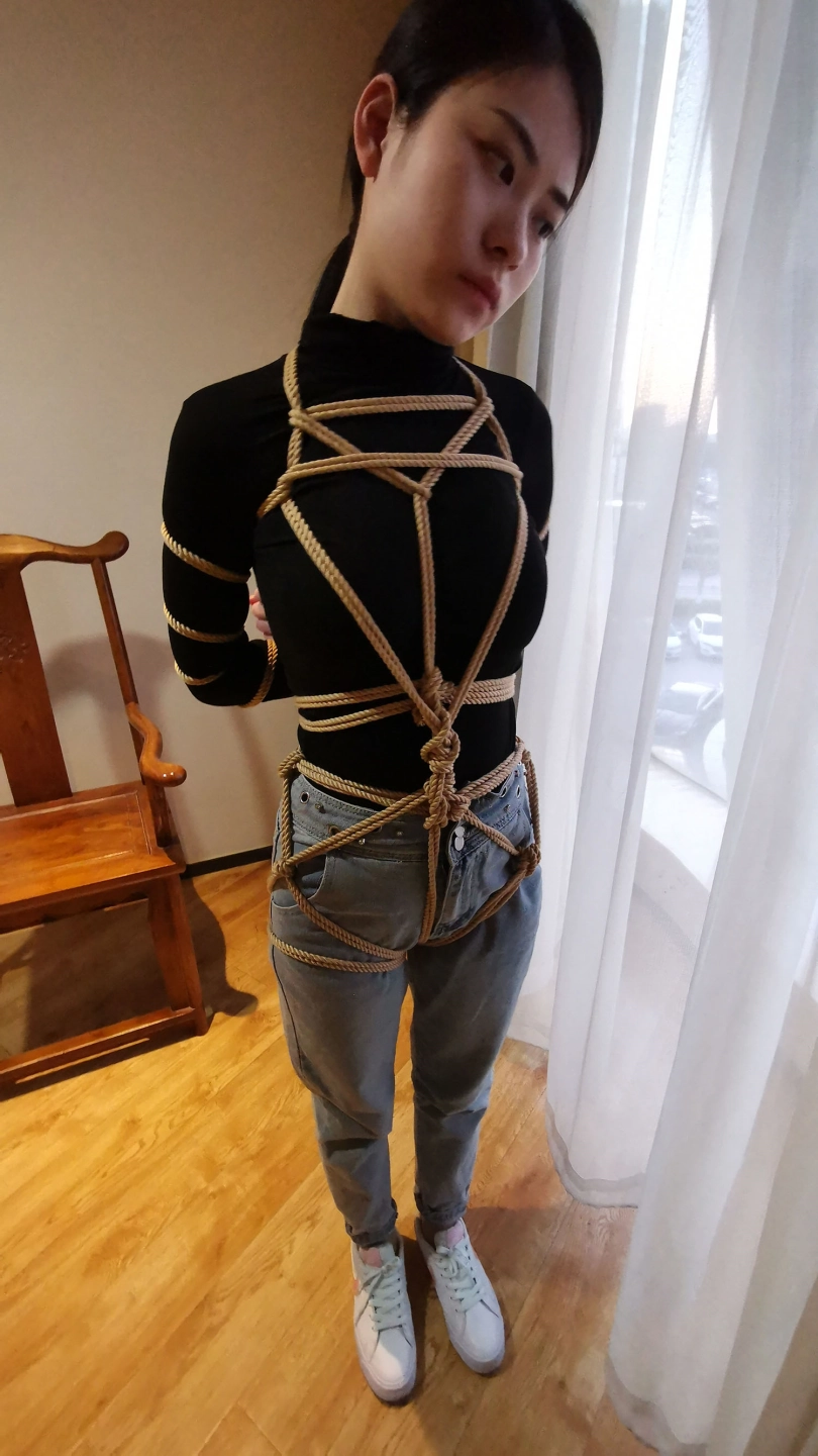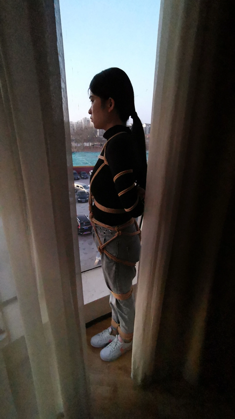 五花大绑后逼迫站在窗台前,正好被楼下的人看到,吓得赶紧躲到窗帘后面,身上密密麻麻用绳子绑着,尤其是屁股上用了不少绳子。放到床上绑上驷马,脱掉鞋子挠痒玩弄丝足。。。