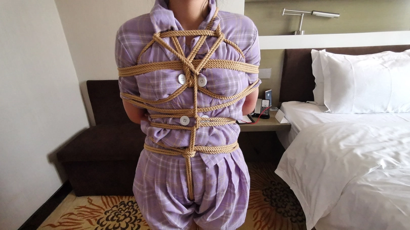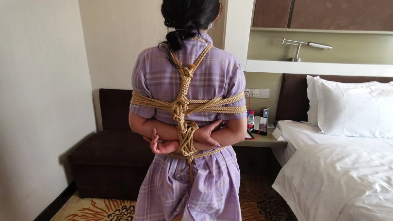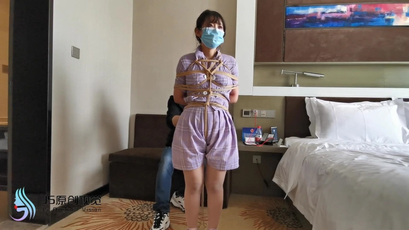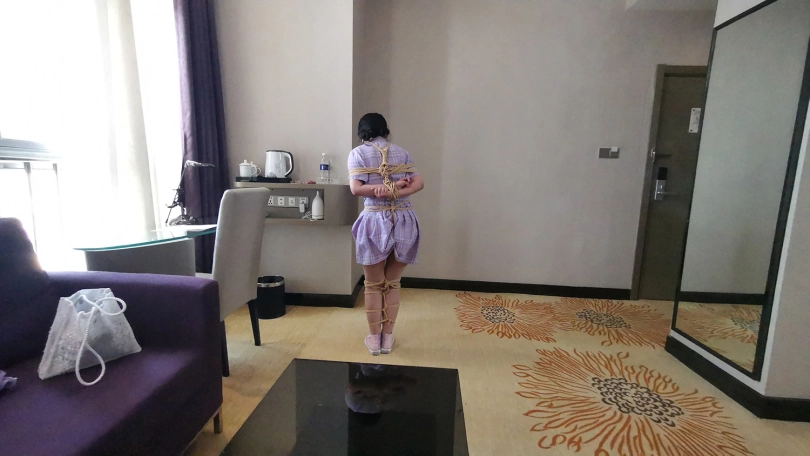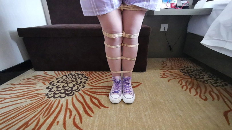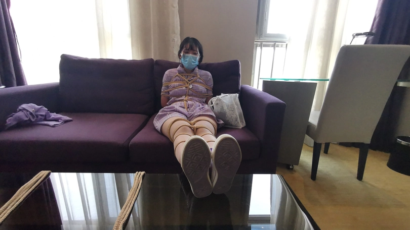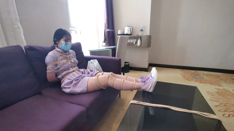 新人琳洛,90后妹子一枚,对捆绑很好奇感兴趣过来体验。全身捆绑后让其在房间里像兔子一样蹦跳,妹子也挺实在,蹦的频率这个快,不一会就气喘吁吁。让她坐在沙发上休息,自己试着挣脱脚上的束缚,双脚不断挣扎,脚上的绳子居然松动了,辛亏她穿的鞋子鞋带系的比较紧,鞋子自己脱不下来,不然真的会挣脱开来。妹子还是比较面腼腆,有些放不开,慢慢来吧。