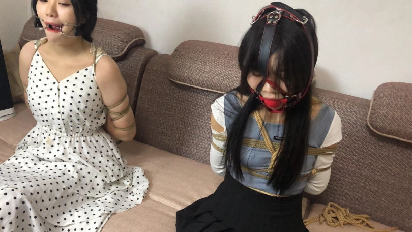 两个高颜值的美女,五官精致,中式五花绑了一个多小时也坚持下来了,韧性挺不错的。另外一个小美女呆萌可爱,带上口球口水就流下来了,想把口球吐出来却做不到,手脚也被绑着动不了,只能任由口水越流越多,把短裙都打湿了一大片,果然女生都是水做的,男生都喜欢水灵灵的女生。最后让两个美女互相解绑逃脱,被绑手脚的她们能否自己解开呢?