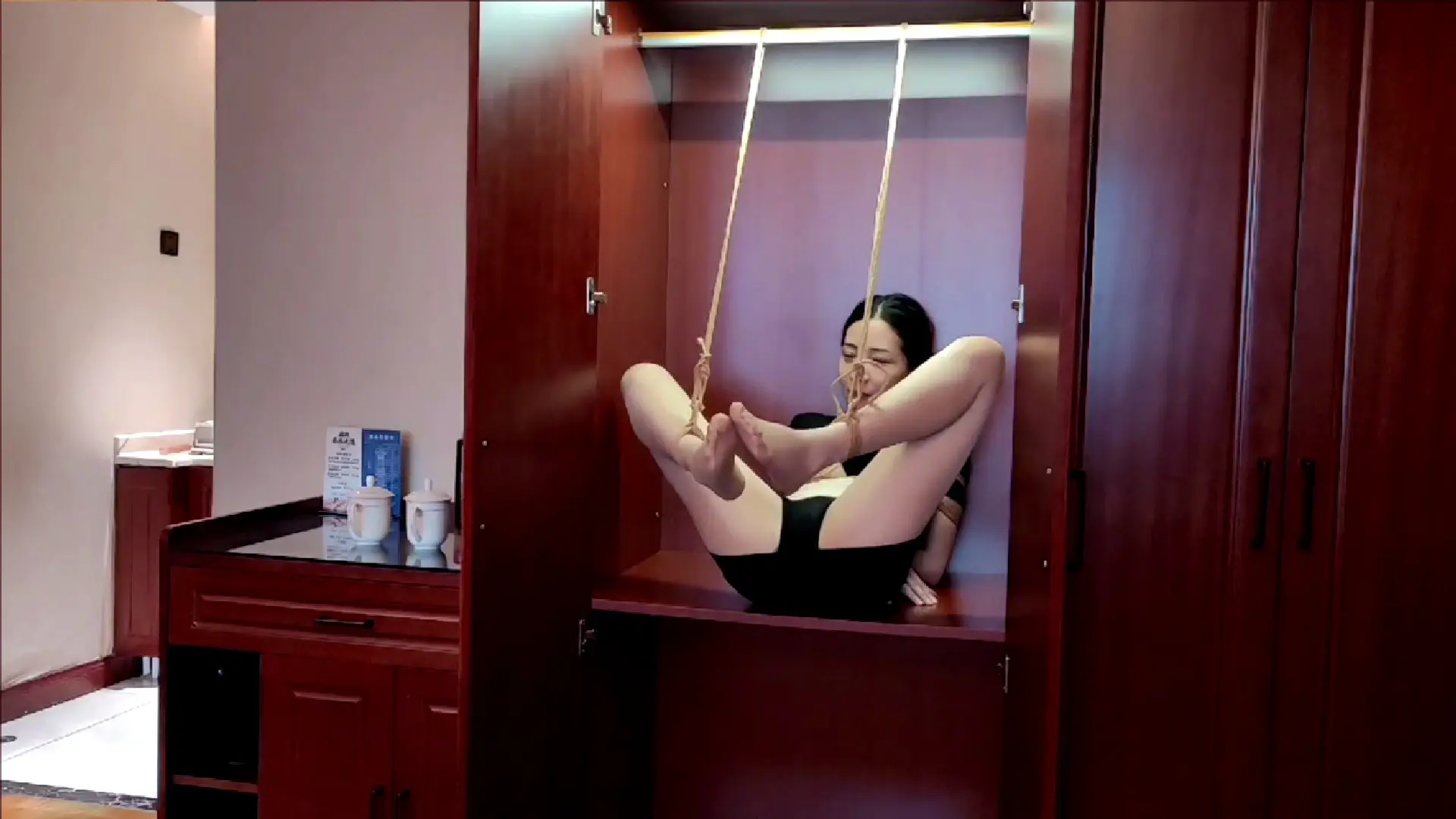 销售员白杨(cc)先来到了酒店房间,精心打扮等待客户的到来,怎料喝下了一杯提前做了手脚的咖啡,趁昏迷之际绑在了衣柜里,白杨醒来后被客户一番玩弄,提绳跪走揪头发鞭打。