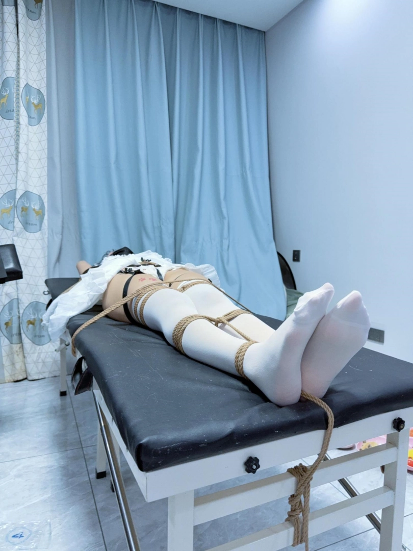 道具:口罩内带了大口径口球,平躺式刑床、全身多道绳子束缚、大量粉蛋、八爪鱼按摩仪、全身TK