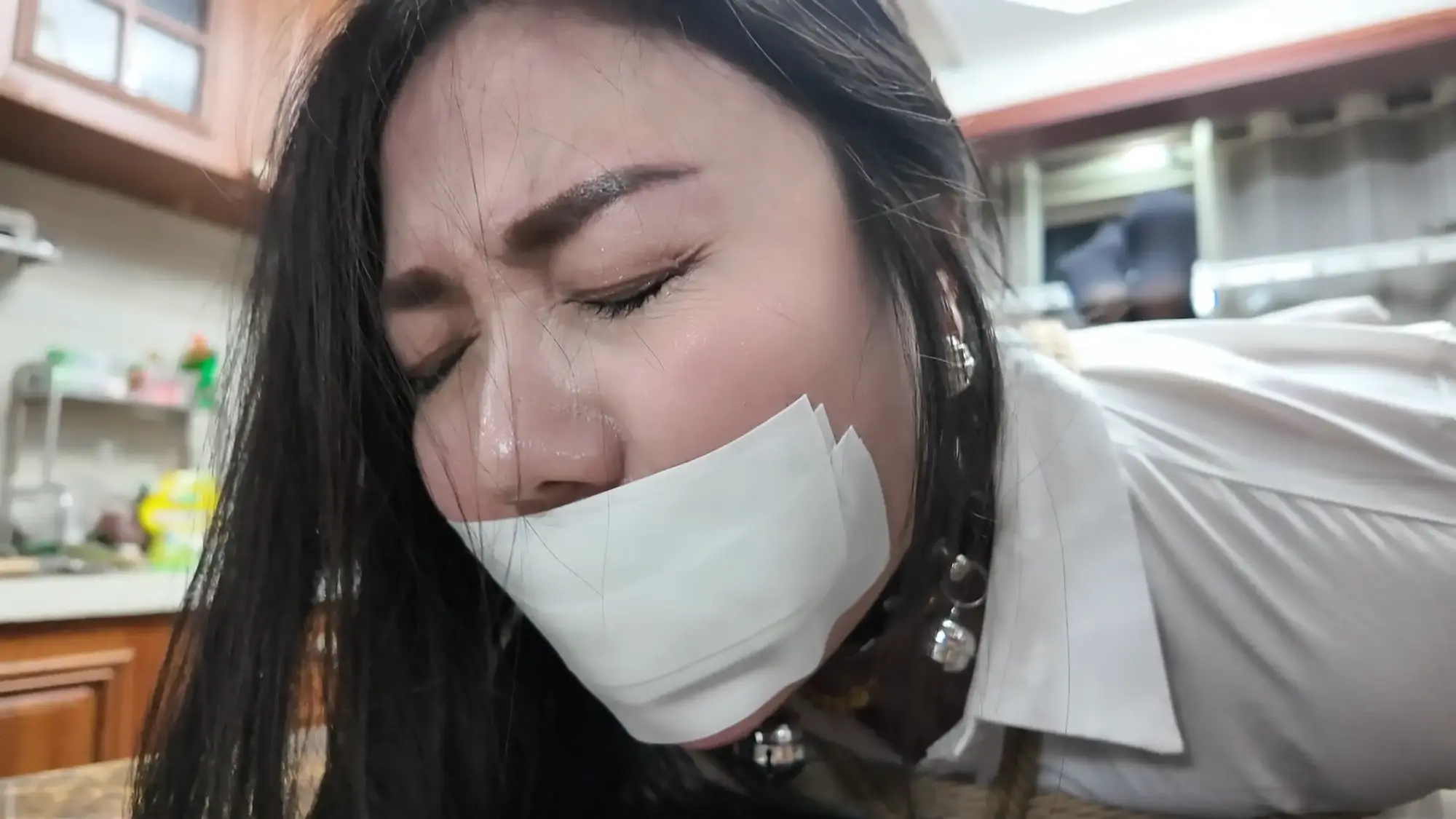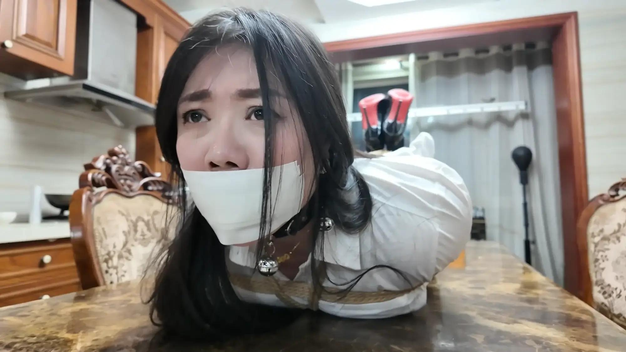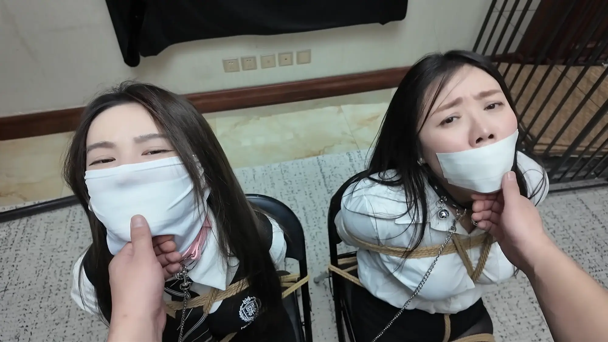 但柴哥可不会因为她们的摇尾乞怜而放过她们,两人被强行牵着蹦跳着坐到了椅子上,