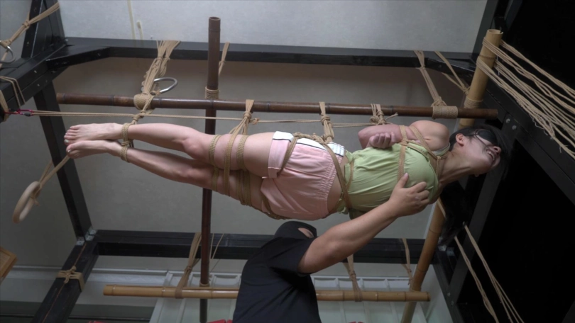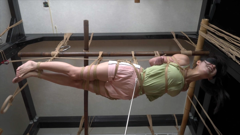 腿和腰也被绳子紧紧缠绕,吊在竹竿上面