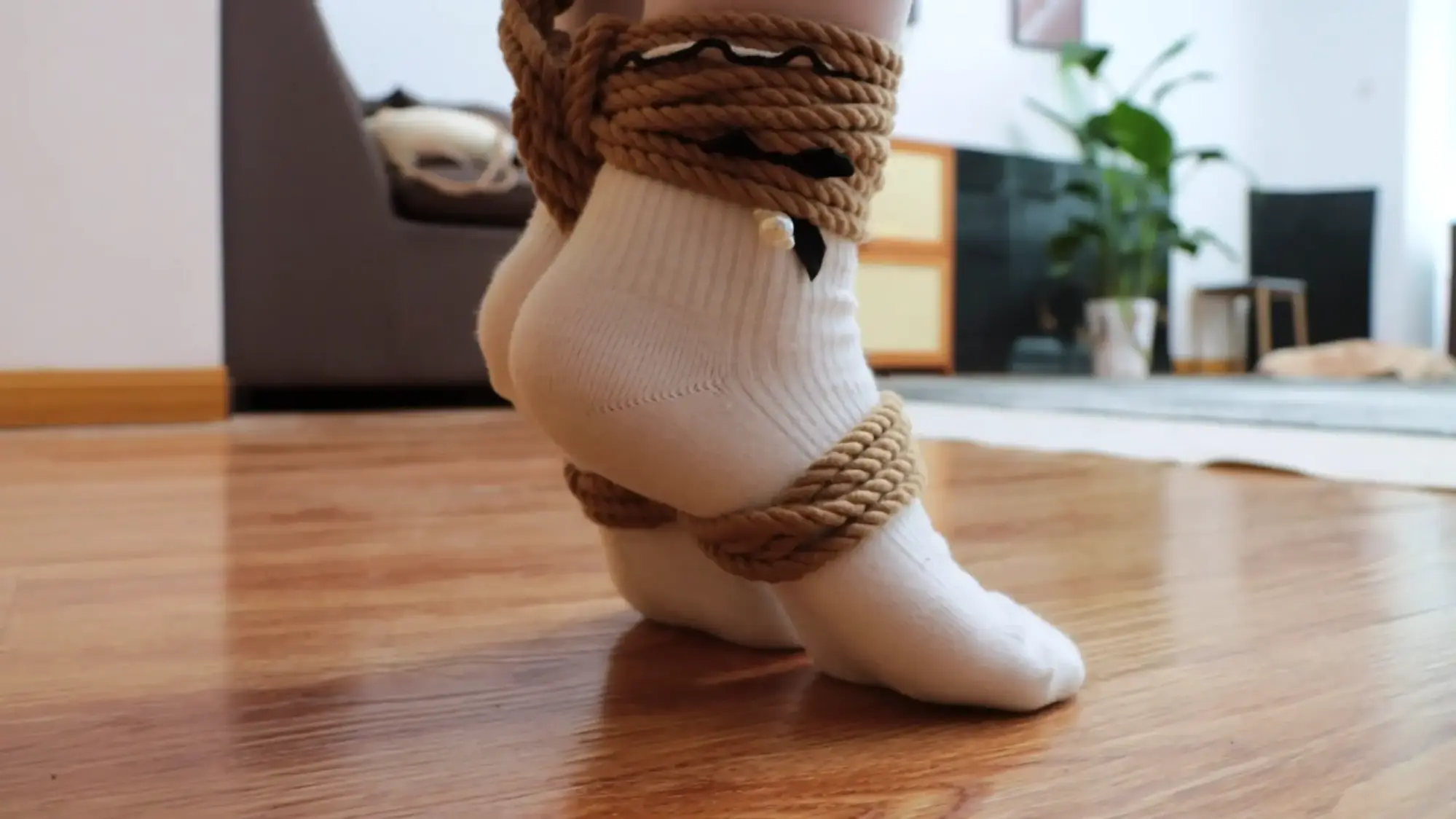 模特先单腿折腿缚在客厅内跳30个来回,坚持了18分钟。在很累的情况下再罚站半小时以上。模特看到的剧本只要罚站5分钟,但绑好之后就不给她解开了。模特快要急哭了。