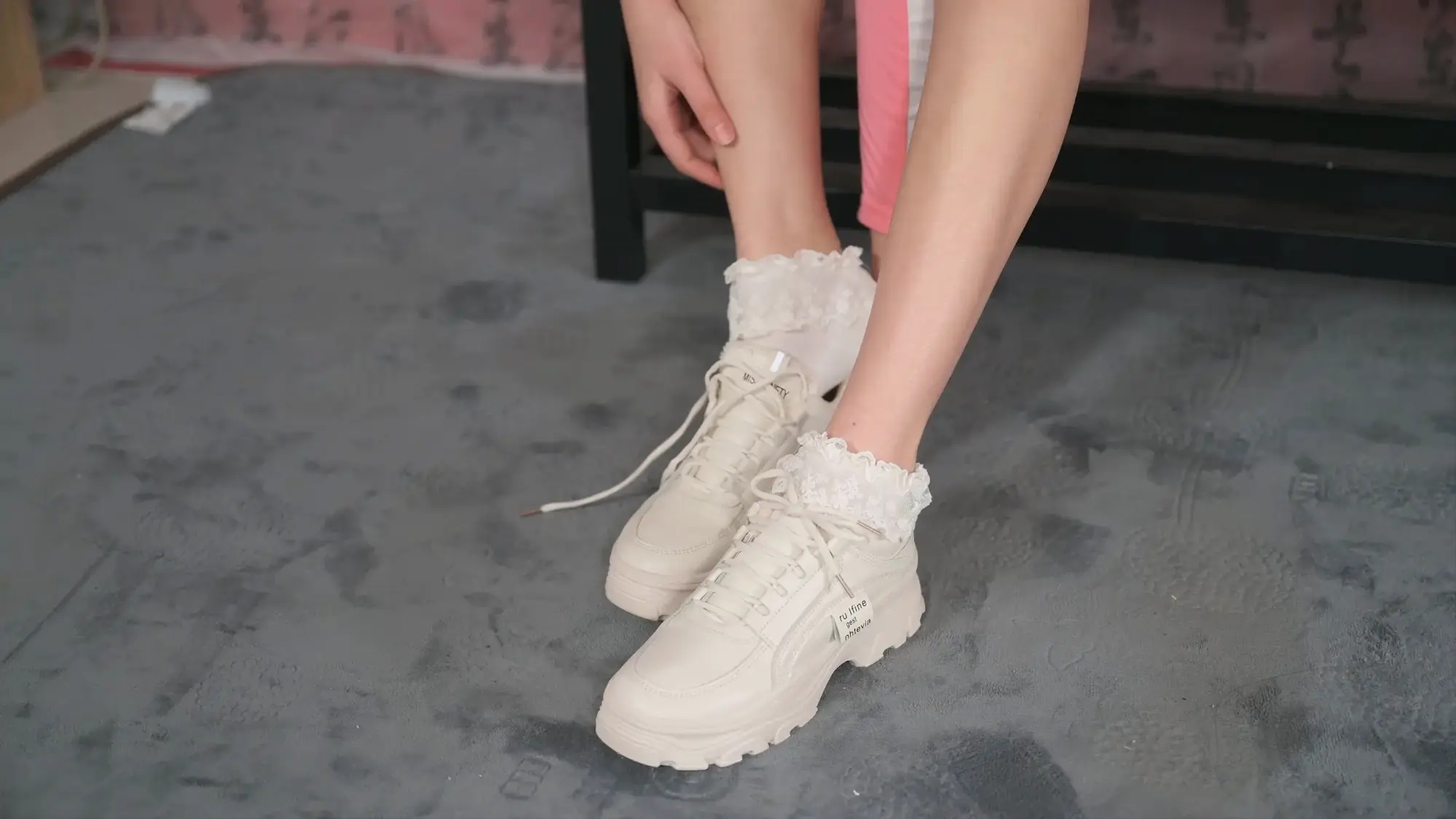 › 【撒琅制造】【美腿玉足系列】高挑足球短裙玫瑰配花边棉袜运动鞋加裸足--(无捆绑)