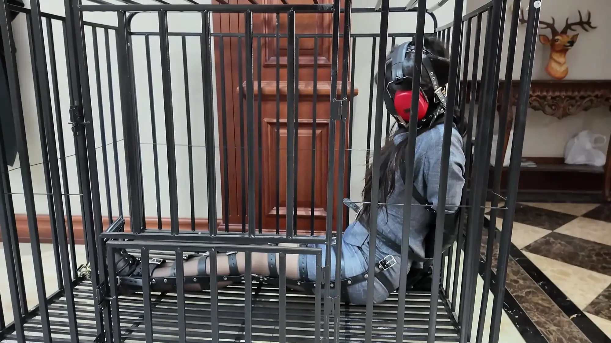 上去了之后,老板说:请我们亲爱的卉萱小姐进去休息一下吧,并指了指面前的笼子,卉萱瞪大了眼,这哪是床,明明是软禁她的囚笼,但是可由不得她,老板给她的腿绑上了最严密的束腿装置。防止她逃跑,然后就粗暴的塞进笼子里。卉萱靠在冰冷的金属栏杆上,试图撞开笼子,金属发出轻微的声响,但是门锁非常牢固,同时眼睛看不见,耳朵也听不见,只能不停的发出呜呜呜的声音,希望有人救她依旧是皮带,类拘束衣束缚,这次的捆绑方式应该是很少见的,却可以出色的完成,可见其实力