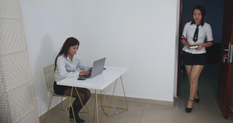 女主在笔记本上写字,老板站起来趴到了墙上,然后用手抚摸自己。