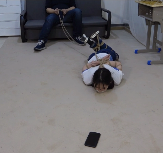 小A努力的往前爬去,扭着全身绳索的身子想够到手机,可在她快要碰到时便被罪犯用绳索拉了回去。