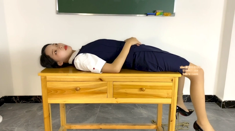 脚也完全固定好,拖了高跟鞋进行tj和 tk 素素求饶也没有用,最后还把素素 绑到四方桌上,进行tj