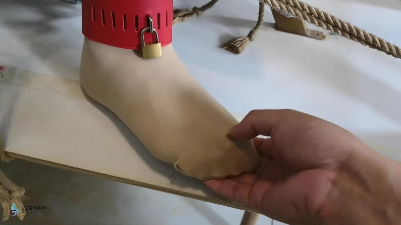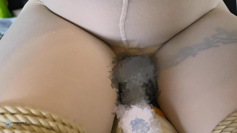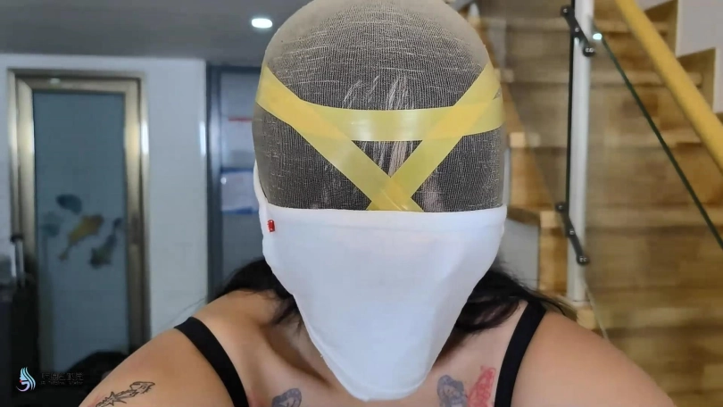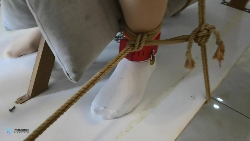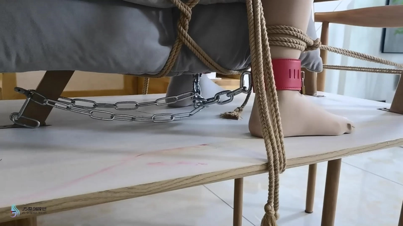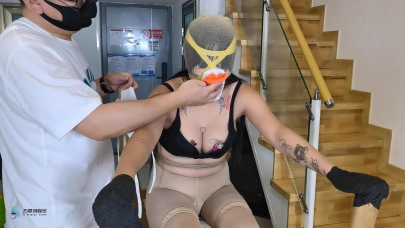 模特穿着肉色丝袜和白棉袜。让她坐在倒过来的桌子的横杠上。脚上戴着皮质镣铐,身体被绳子固定。双手被绷带缠绕固定在两个桌腿上。胸部放上乳夹和TD。嘴里塞着布团,外面用胶带封住,丝袜头套套头,胶带缠绕头部固定。脱掉她一只脚上的棉袜,折叠好放在她的鼻子上,外面在戴上口罩,让她闻自己的原味。再戴上皮质头套。下面固定着棒棒,不断的刺激着。