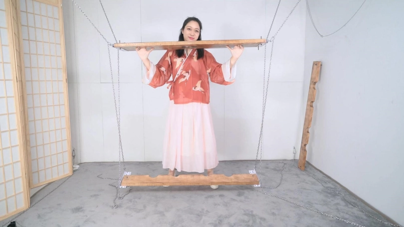 这套古装好似有魔力一般,沐小雨穿上就像戏精附体,表演欲爆棚,我这老演员都差点没接住,微剧情有点意思,不做过多介绍。单说这木枷组合,头一次用铁链连接吊起,固定作用明显,还有足够活动空间,据说古代犯人带着木枷时间过长,能够被活活卡死,我不太相信!于是顺着她的剧情,把沐小雨和木枷一起解下来,还真让她找到了求生姿势,就不知道如果戴着我这套厚重木枷能坚持多久了。