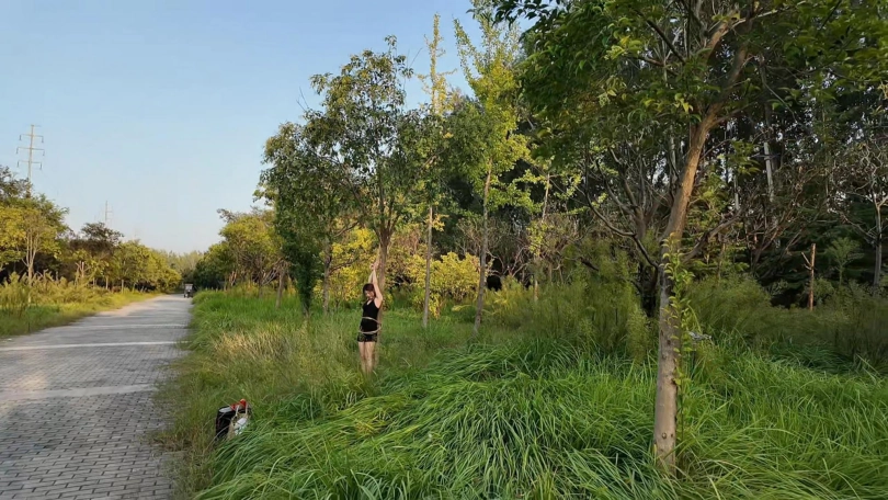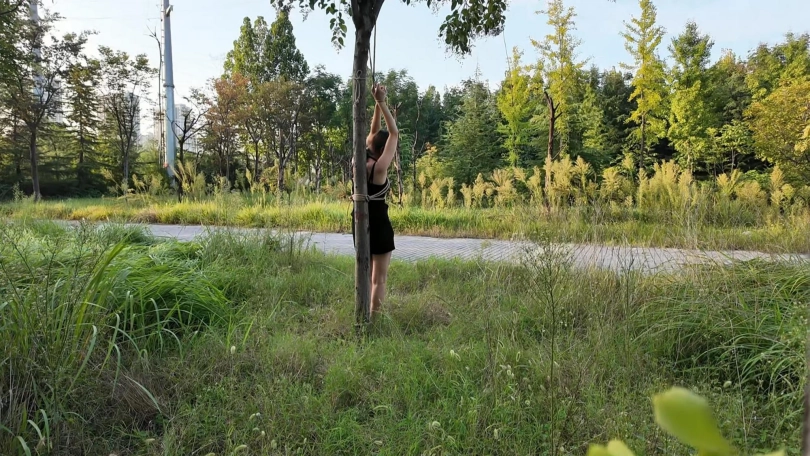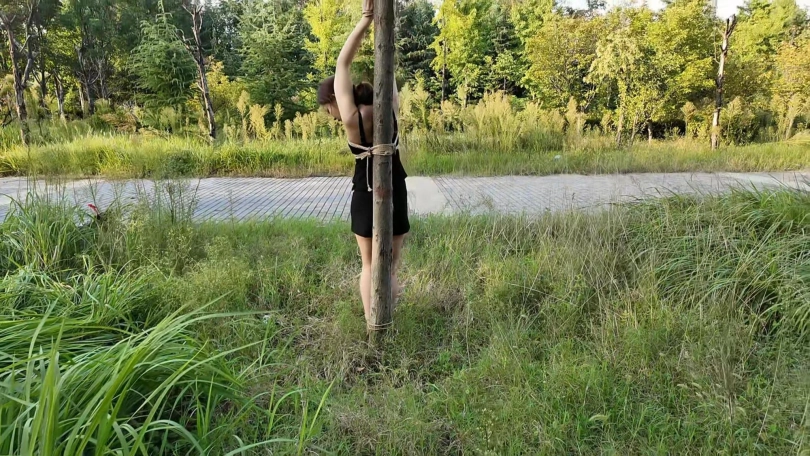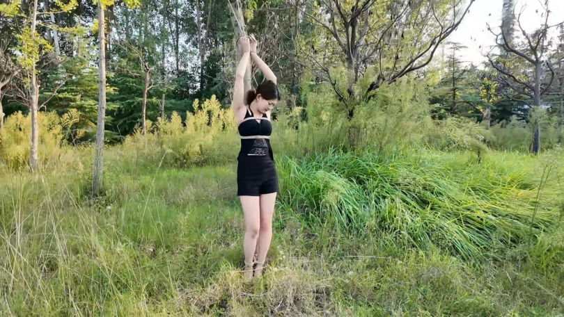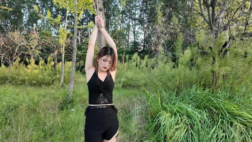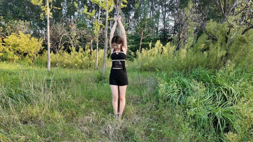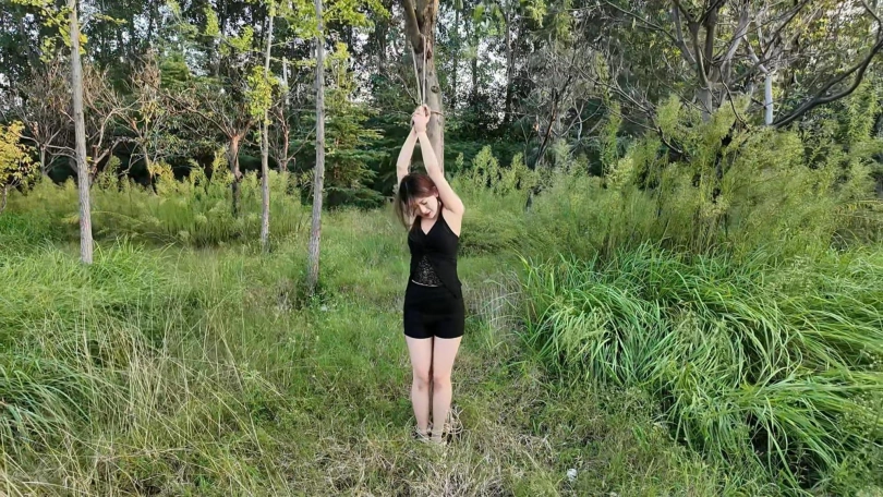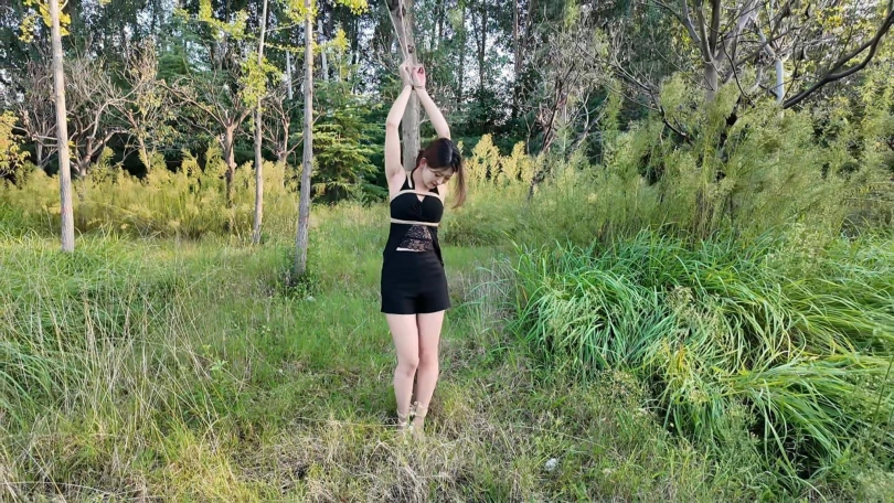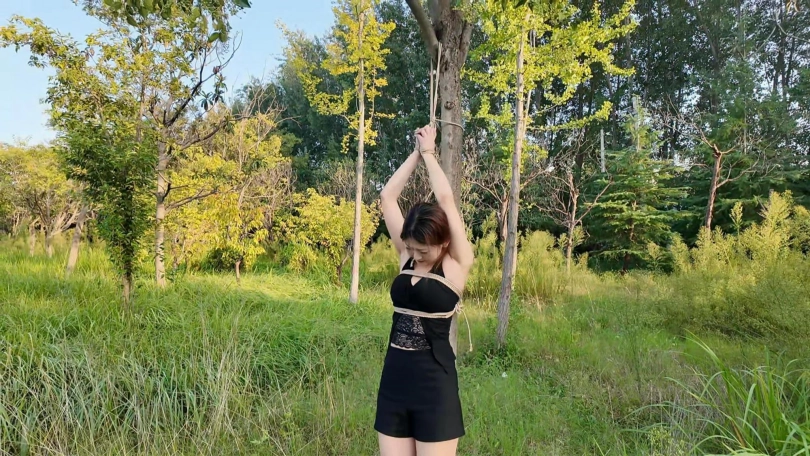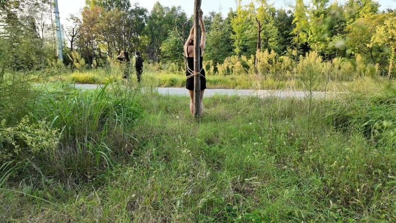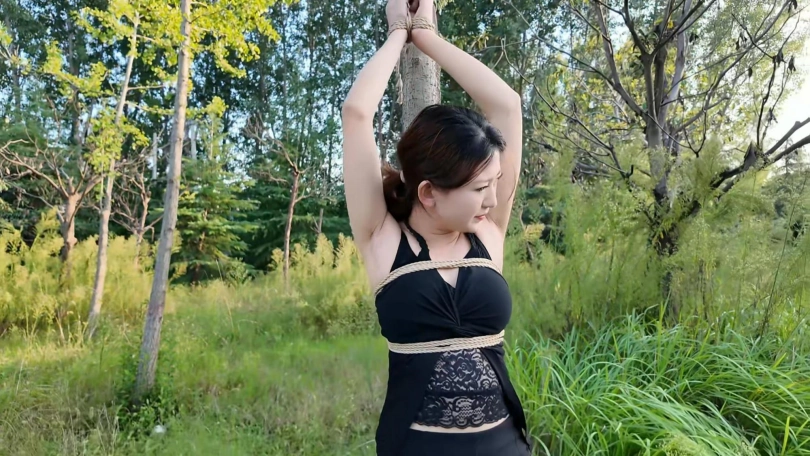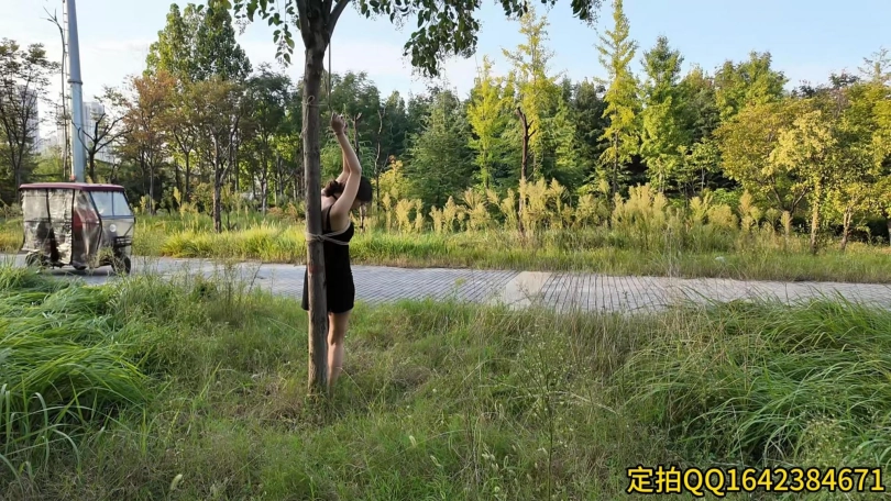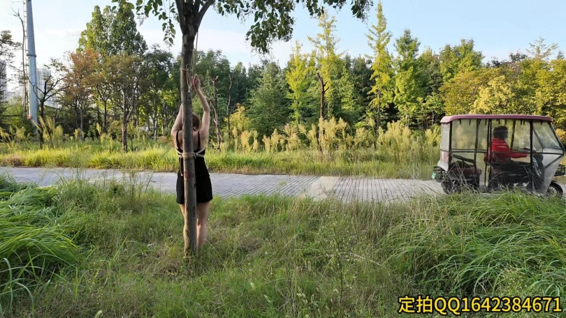 要求把晓琴绑到路边树上半小时,第一次户外,多少心里还是很紧张的,绑好躲在后面草丛录像,真是应了那一句话,在偏僻的地方都会有人,期间又辆三轮车路过,好像里面的人还扭头看了一眼,真是紧张坏了,最后采访晓琴感受,夏天还是蚊子太多,腿上咬了二十多个包,真是辛苦这个敬业的模特的了