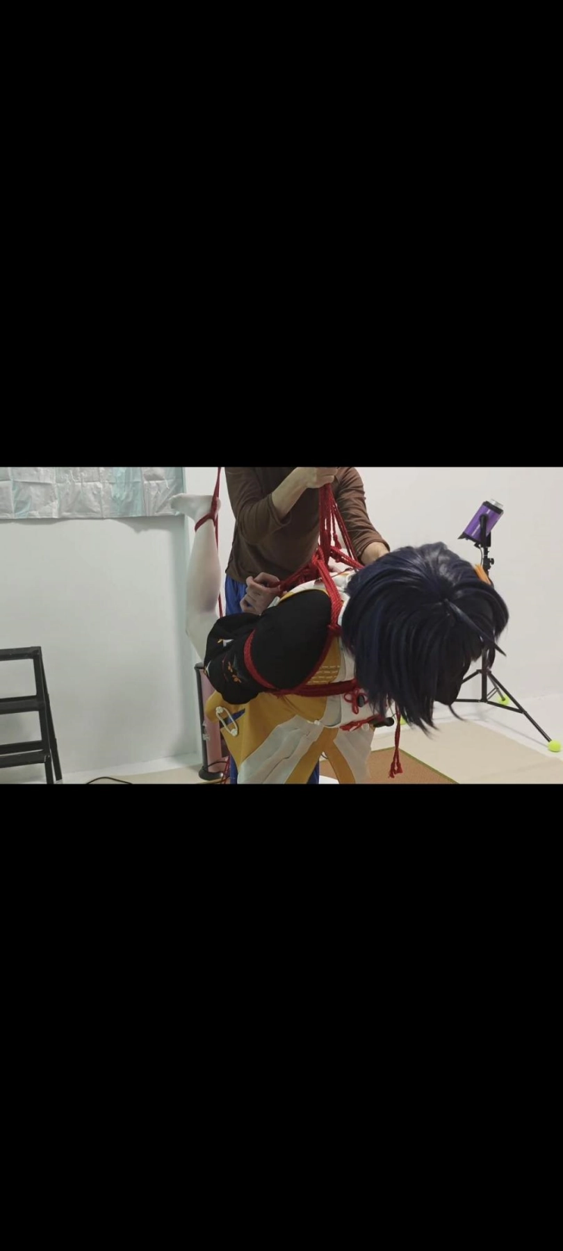 捆绑完之后当然是吊起来啦。一开始吊人可以一条腿一条腿慢慢来。让人有准备的升空。就不会很突然。至于后面出现的玩弄她的人。就不得而知了hhh