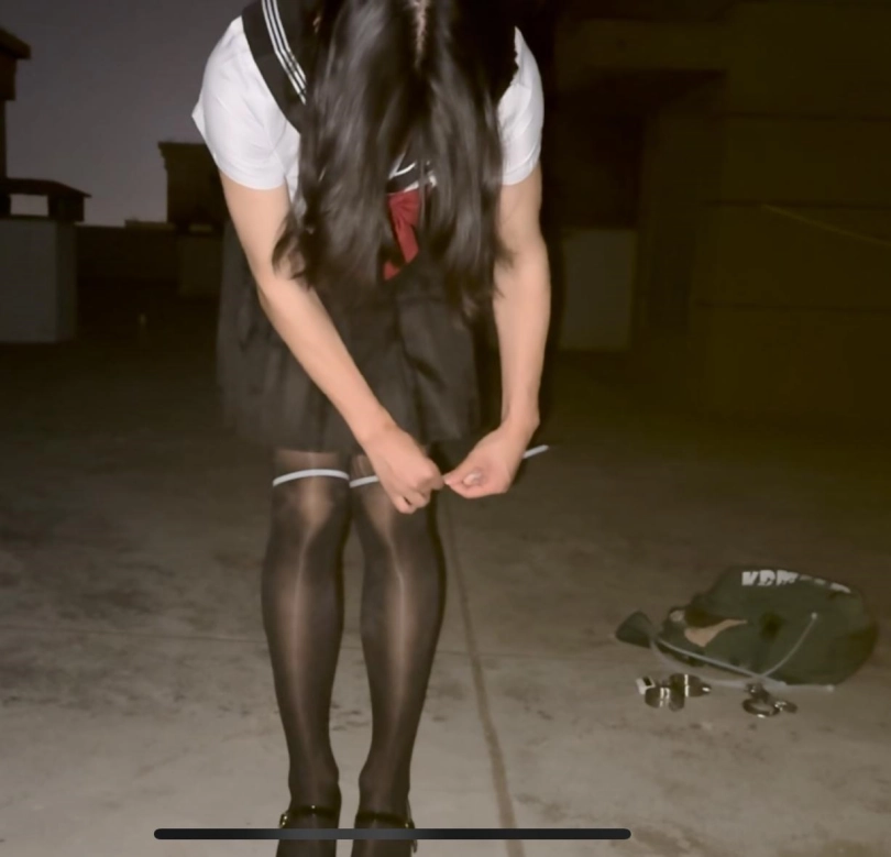 提前再后面塞满了,再用黑丝包裹住,穿上裙子和水手服,高跟鞋,来到这个不知道会不会有人经过的天台。经常听到电梯上下的声音,特别害怕有人过来看到我aaaaaaaa