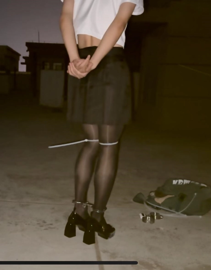 黑色马油丝袜也被弄破了,高跟鞋也有点挤脚,定时锁定了十五分钟,可我感觉像几个小时那么漫长。定时锁自缚,而且还是没有一点容错的手铐脚铐自缚,真的铐上之后非常无助,除非时间到了,否则没有任何退路可言,紧张、刺激感与露天自缚的羞耻感伴随着下意识对锁可能坏掉的担心一同到来。