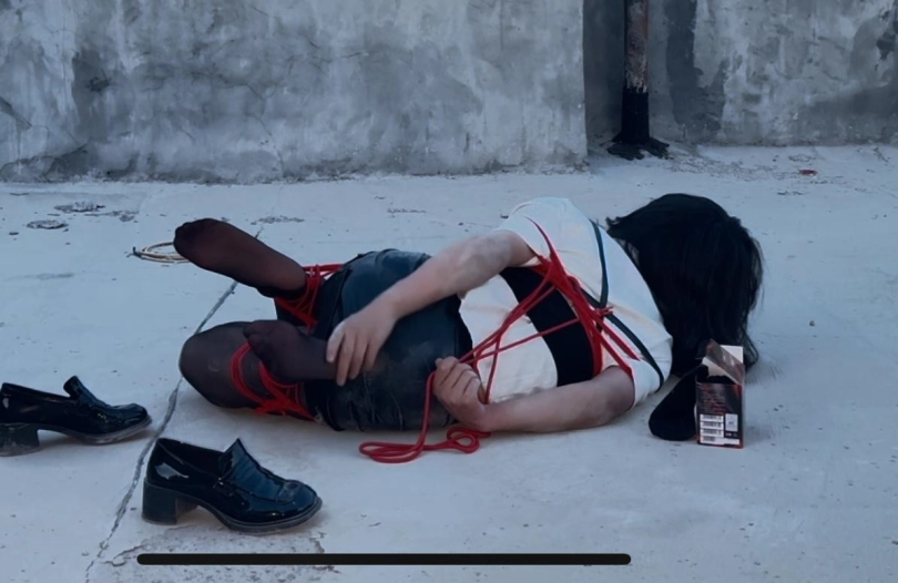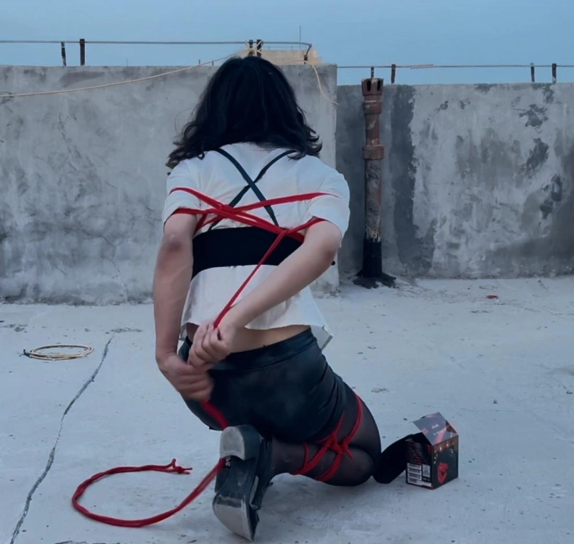 这次用的是两条十米的绳子,一条用来做一个简单的折腿缚,一条绑了一个日式自缚,因为天快黑了,甚至能在视频里看到日光逐渐变暗的过程,以至于后来闪光灯都自己启动了。这次绑好腿后,膝盖和双腿以及被小皮鞋包裹的脚就一直特别难受特别疼,绑好以后就想着赶快解开,结果还是费了好大力气才勉强解开。